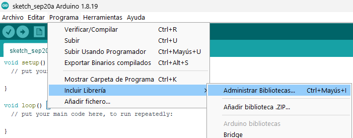 Ya abierto Arduino, para instalar una nueva librería, ve a la parte superior izquierda de la ventana del programa, selecciona **Programa**, clic en **Incluir Librería** y **Administrar Bibliotecas**.