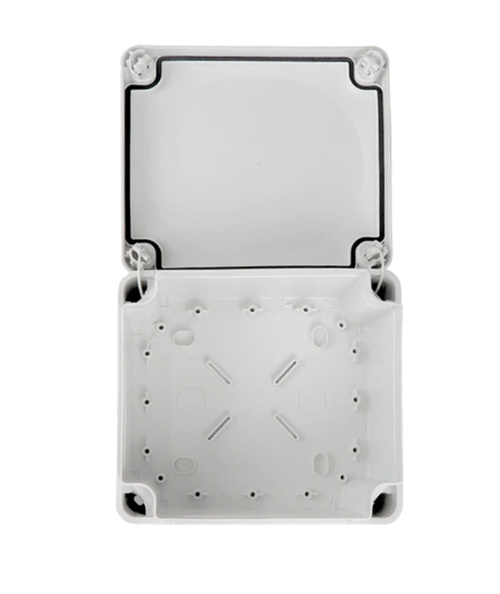 Esta caja tipo pared lisa (con lados cerrados) de sellado con tornillo cuenta con una tapa a presión con cierre hermético IP65 y 12 entradas compatibles con tubo conduit PVC y galvanizado. Está hecha de un material termoplástico, auto extinguible.
