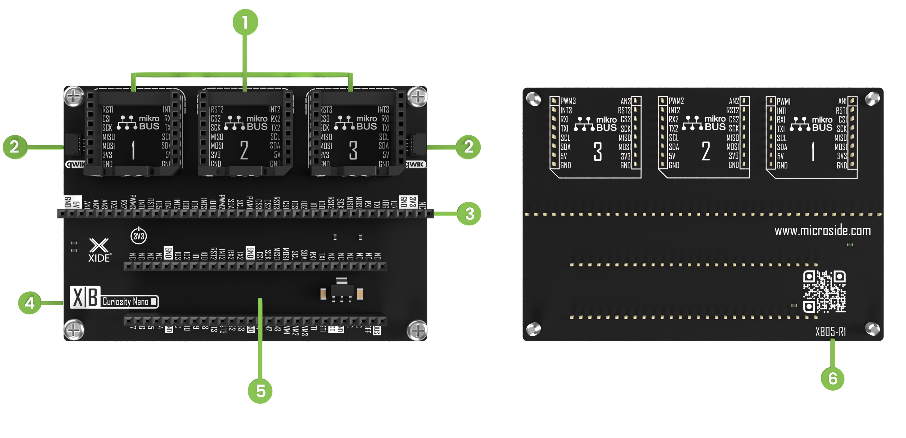 **X-BOARD Curiosity Nano** brinda una comunicación entre tarjetas Curiosity Nano con módulos **X-NODE**, [**Click Boards™**](https://www.mikroe.com/click-boards) y diversas herramientas de desarrollo que posean el estándar [**mikroBUS™**](https://www.mikroe.com/mikrobus) con solo insertarlos en los zócalos correspondientes de la tarjeta. Posee dos conectores JST para un uso con módulos compatibles con el estándar [**Qwiic®**](https://www.sparkfun.com/qwiic), teniendo en cuenta que el nivel lógico de voltaje es a 3.3 V. Por último, se integra un header hembra para disponer de los pines de cada zócalo, de esta forma se puede acceder a señales de forma no invasiva o utilizar un analizador lógico en diversas pruebas de funcionamiento.