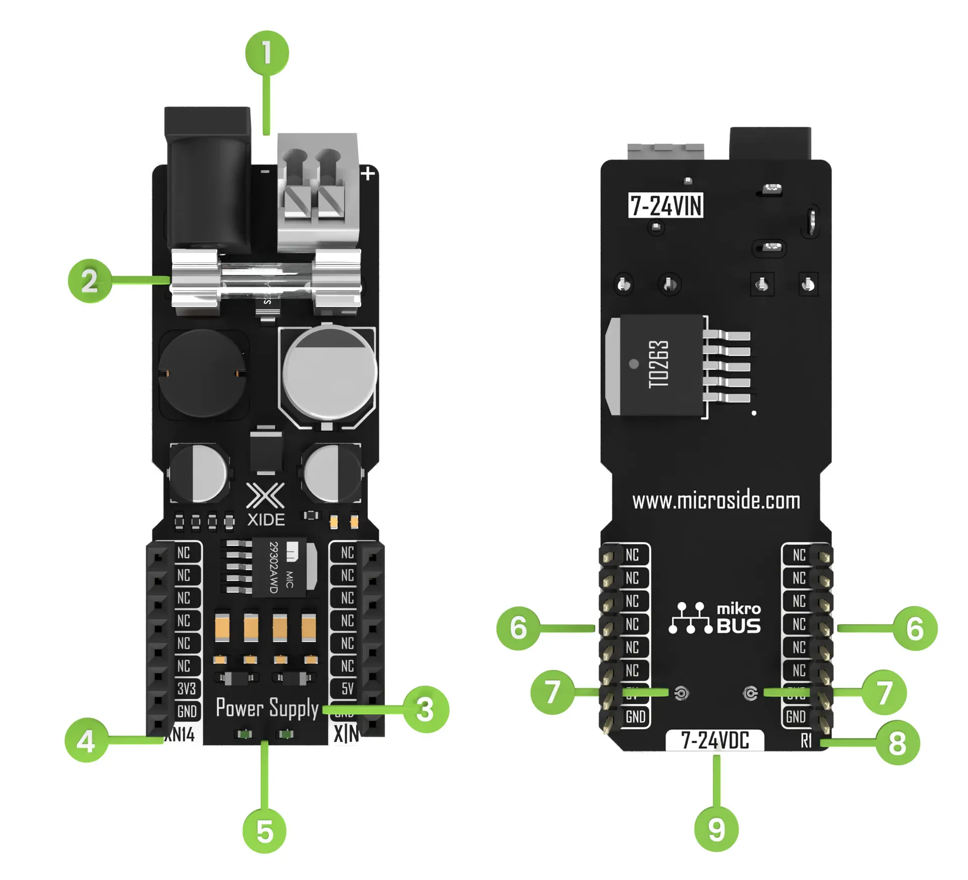 &#x20;El **X-NODE Power Supply DC** es compatible con el estándar [**mikroBUS™**](https://www.mikroe.com/mikrobus) de [**Mikroe®**](https://www.mikroe.com/) para un uso fácil con una gran variedad de kits para desarrollo de hardware.