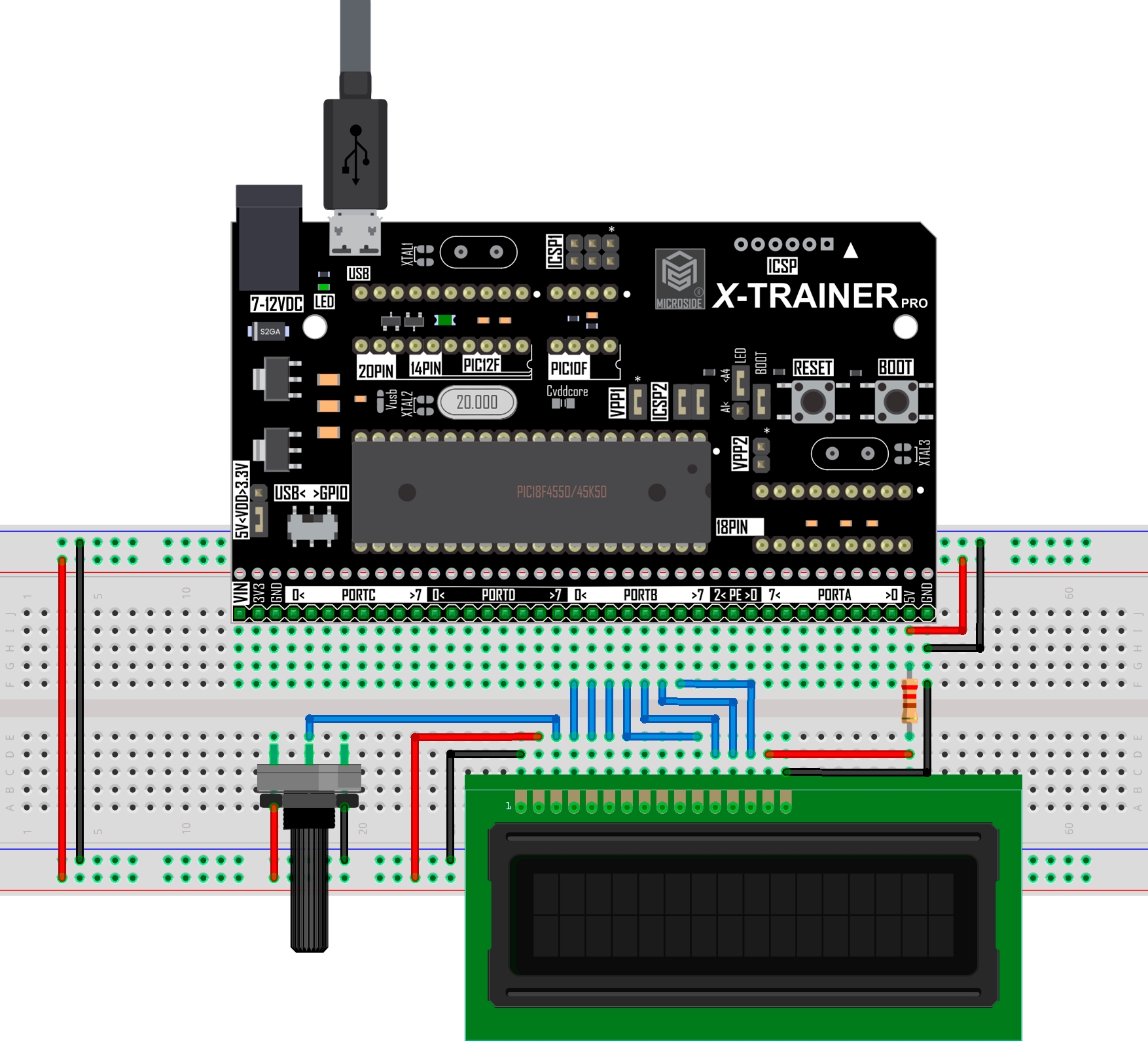En esta práctica se visualiza un mensaje a través de una pantalla LCD (Liquid Crystal Display) de 16×2, para la comunicación de datos se encuentra conectada al puerto B de la tarjeta X-TRAINER.
