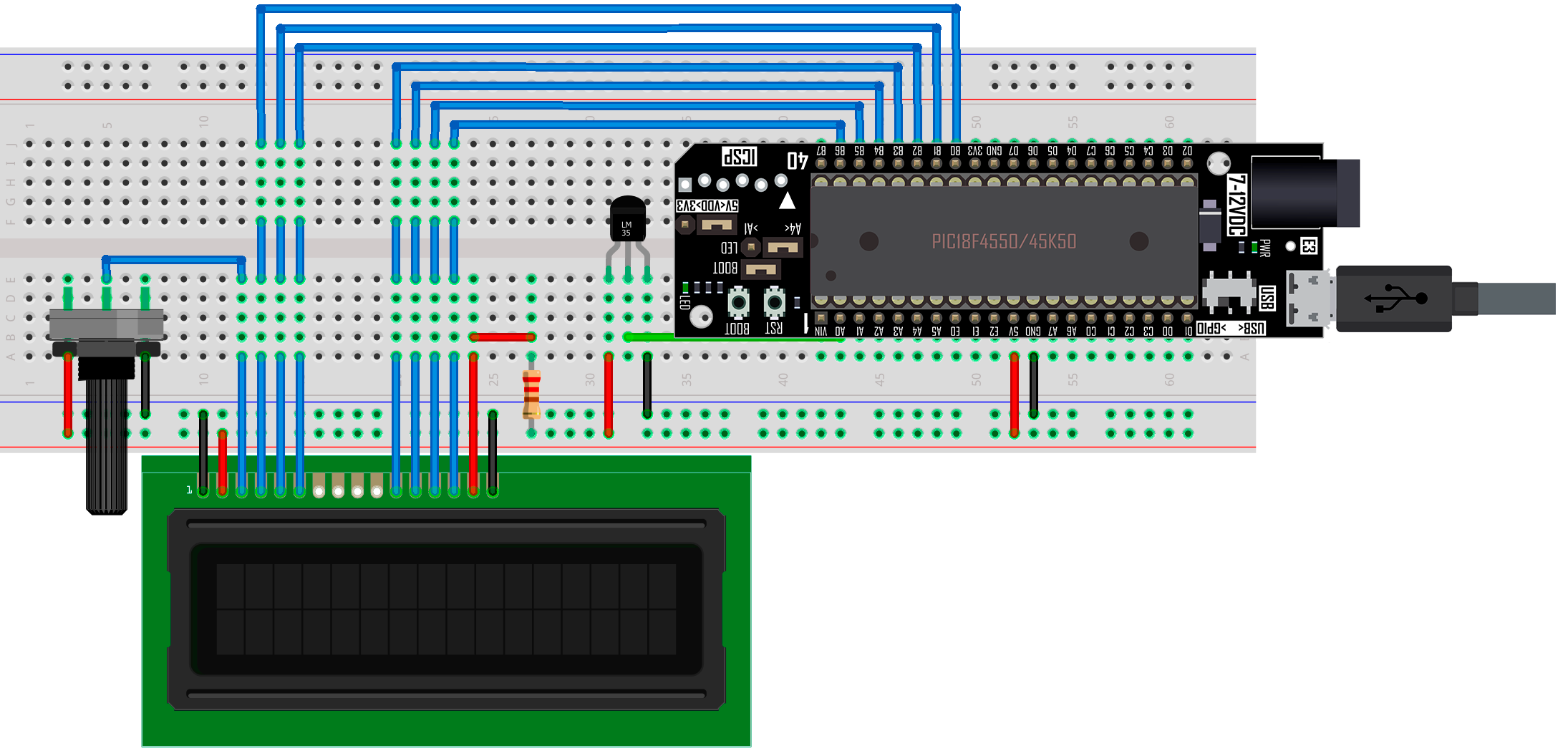 En esta práctica se realiza una medición de temperatura (ºC) con el sensor LM35, visualizando el resultado de la medición a través de un display LCD (16×2), usando la tarjeta **X-TRAINER** con el **PIC18F4550/PIC18F45K50**.