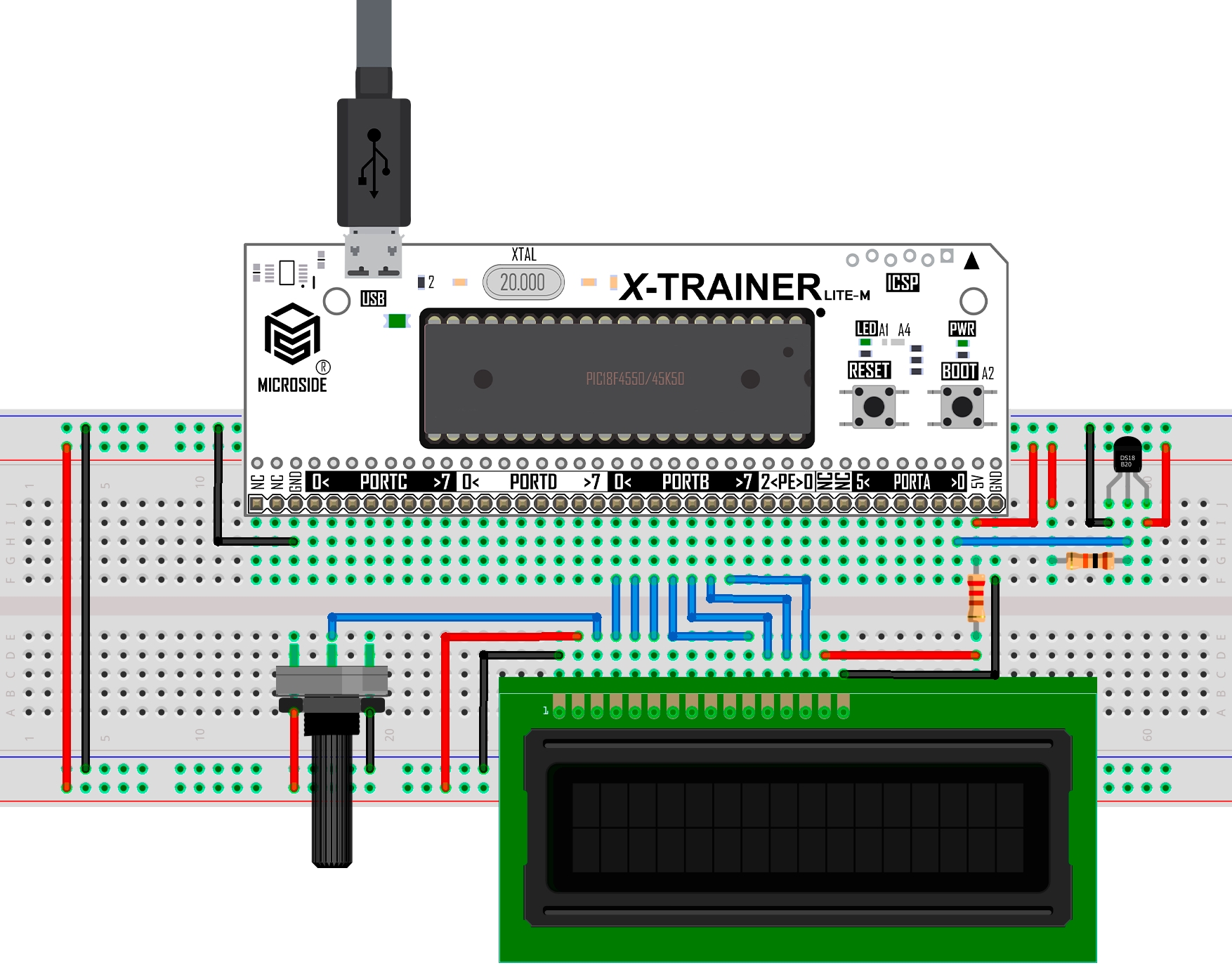En esta práctica se realiza una medición de temperatura (ºC) con el sensor DS18B20, visualizando el resultado de la medición a través de un display LCD (16×2), usando la tarjeta X-TRAINER con el PIC18F4550/PIC18F45K50.