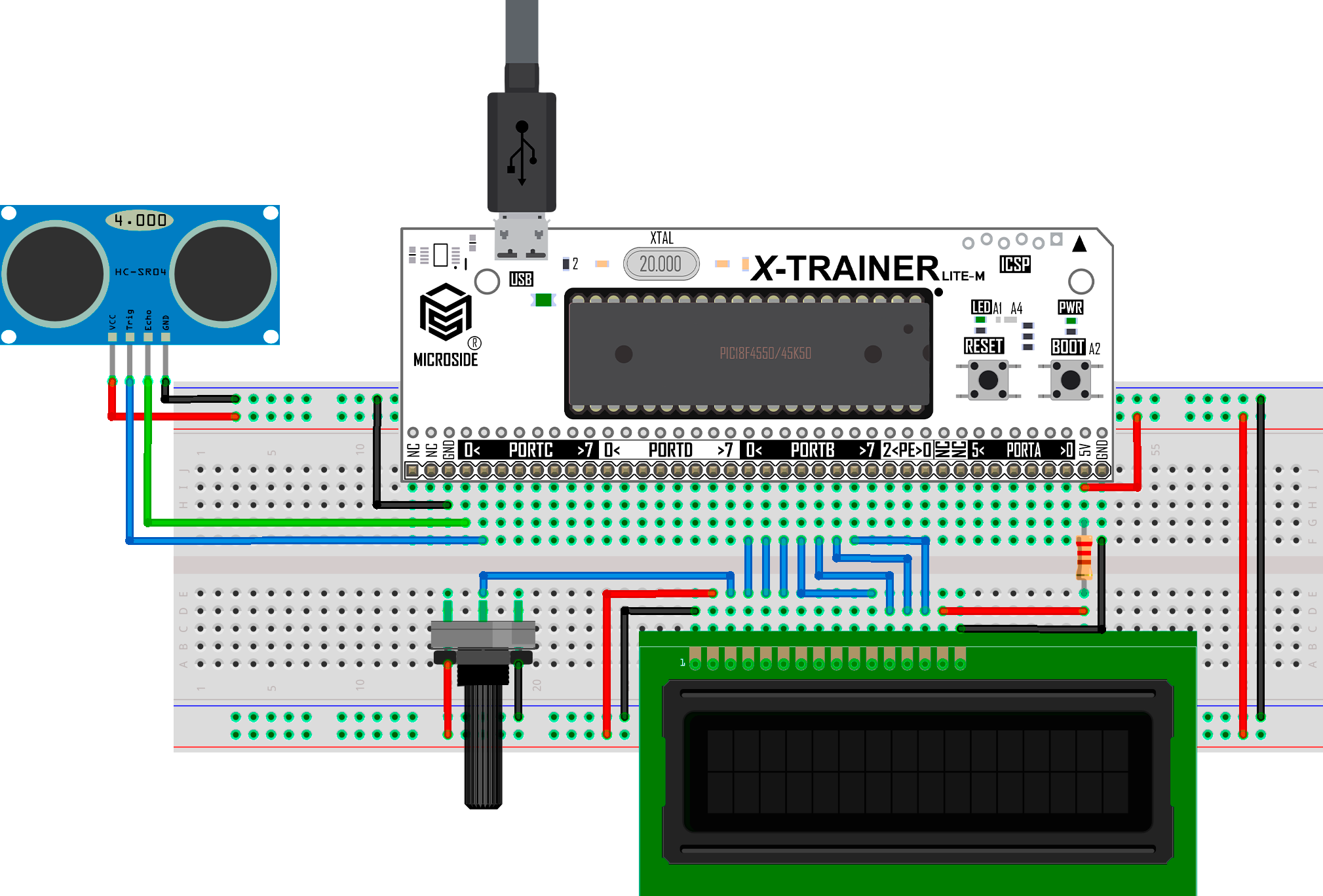 En esta práctica se realiza una medición de distancia (cm) utilizando el sensor ultrasónico HC-SR04, visualizando el resultado de la medición a través de un display LCD (16×2), usando la tarjeta X-TRAINER con el PIC18F4550/PIC18F45K50.
