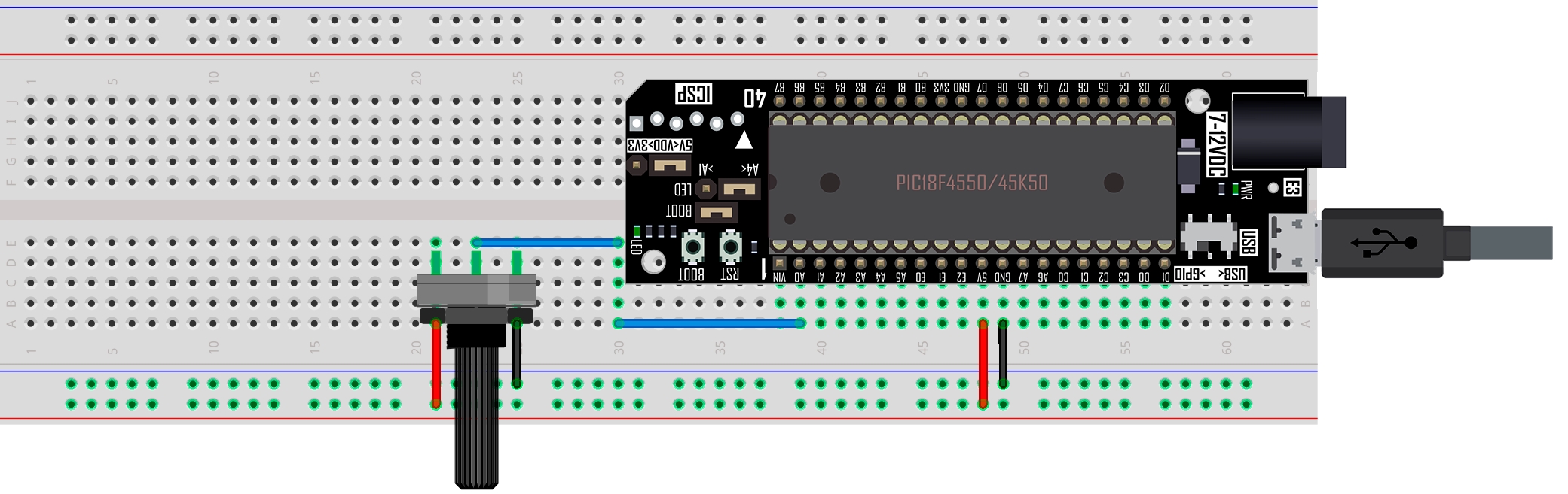 En esta práctica se implementa una lectura analógica utilizando un potenciómetro, el cual se conecta la tarjeta X-TRAINER con el PIC18F4550/PIC18F45K50. El potenciómetro se conecta en el pin A0, el cual se configura como entrada y señal analógica donde, si el valor del ADC supera un Set Point se podrá visualizar el encendido del LED conectado al pin A4 incluido en las tarjetas X-TRAINER.