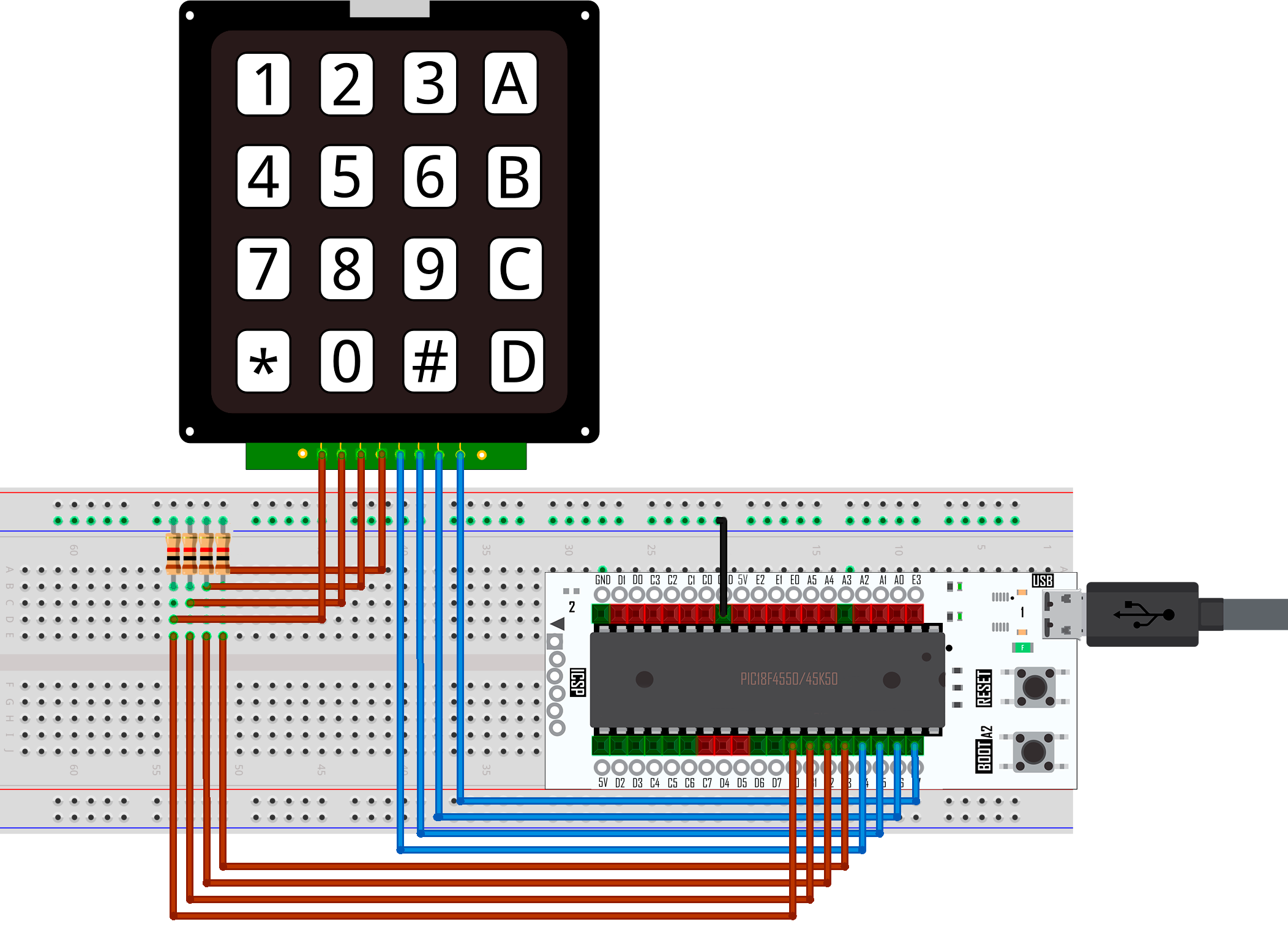 En esta práctica se realiza el control de encendido y apagado del LED incluido en la tarjeta X-TRAINER con el PIC18F4550/PIC18F45K50. También se utiliza un teclado matricial de 4×4, el cual está conectado en el puerto B con 4 resistencias configuradas como pull-down (B0-B3). Para encender el LED se presiona la tecla 1 y para apagar el LED se presiona la tecla 0.