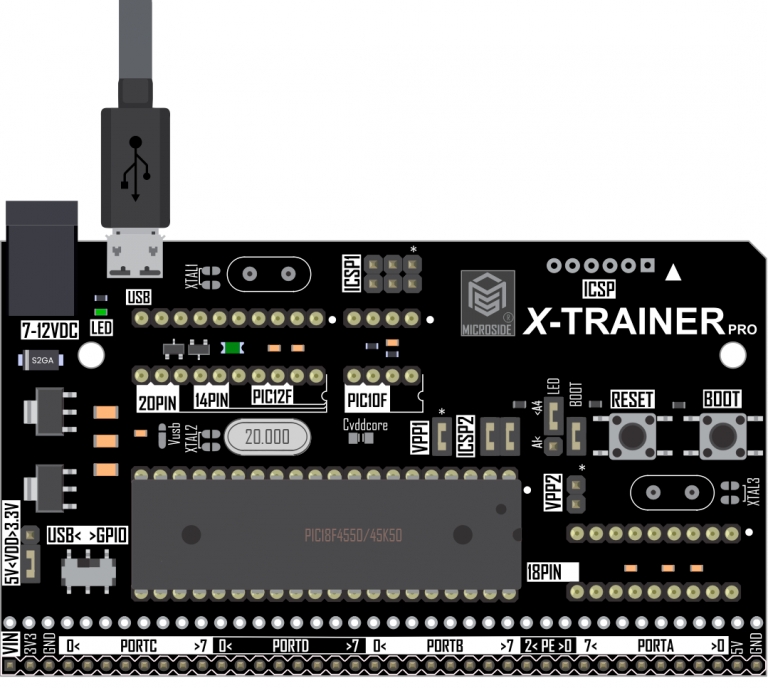 4. Abre el Software X-TRAINER Suite v1.0 en el apartado PIC18F4550/45K50, selecciona el archivo .hex generado al compilar el proyecto y programa la tarjeta.