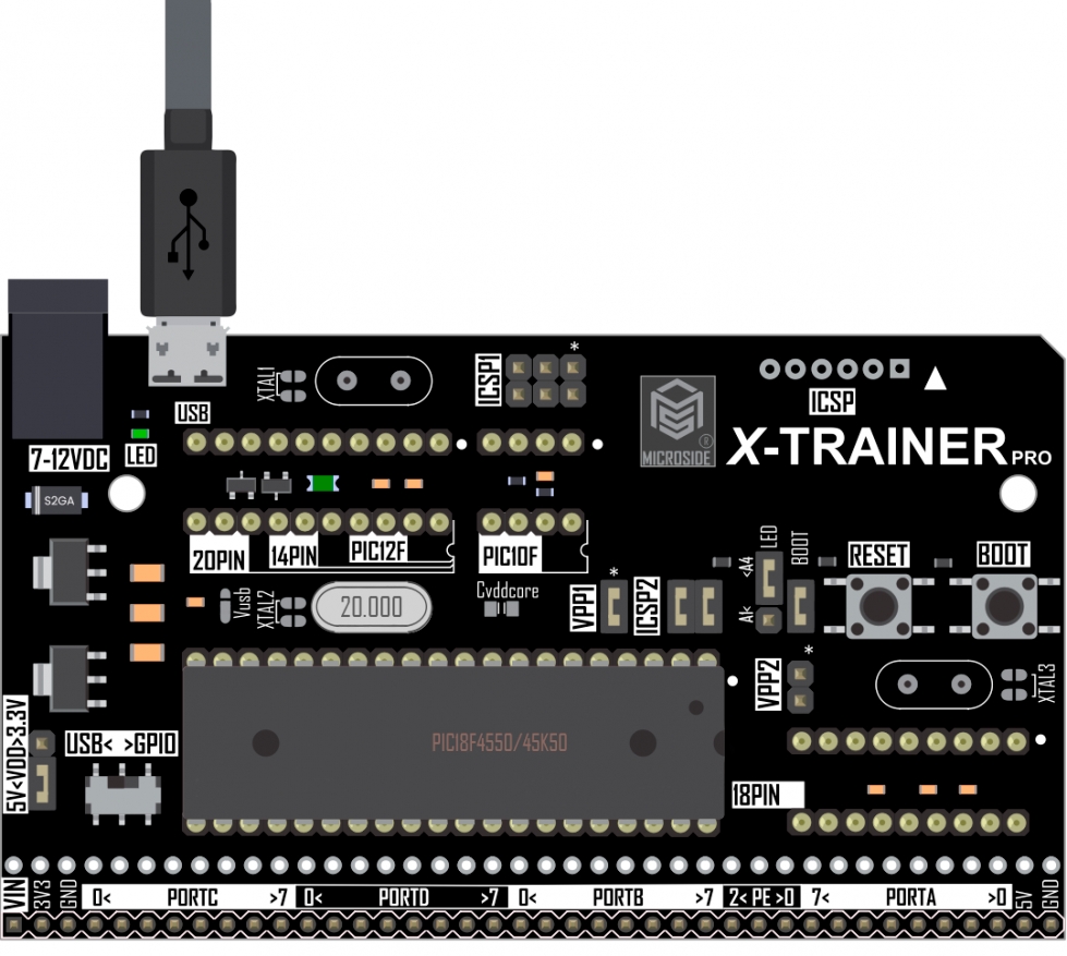Abre el Software X-TRAINER Suite v1.0 en el apartado PIC18F4550/45K50, selecciona el archivo .hex generado al compilar el proyecto y programa la tarjeta.
