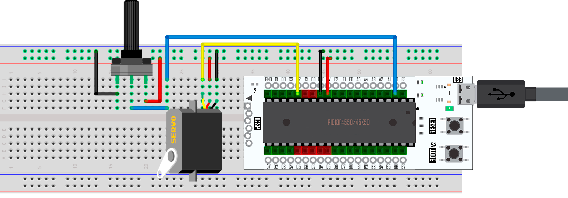 En esta práctica se implementa el control de giro de un servomotor a través de un potenciómetro. Se usa el módulo PWM para el control del servomotor y el módulo ADC para variar la posición por medio del potenciómetro.