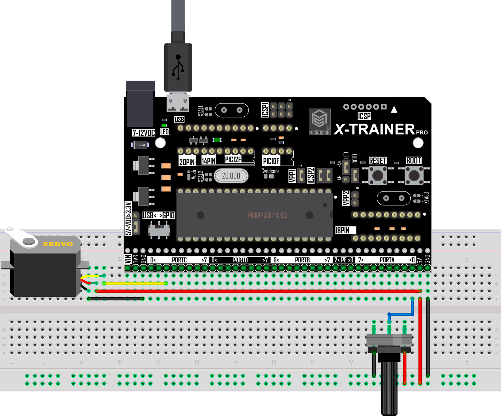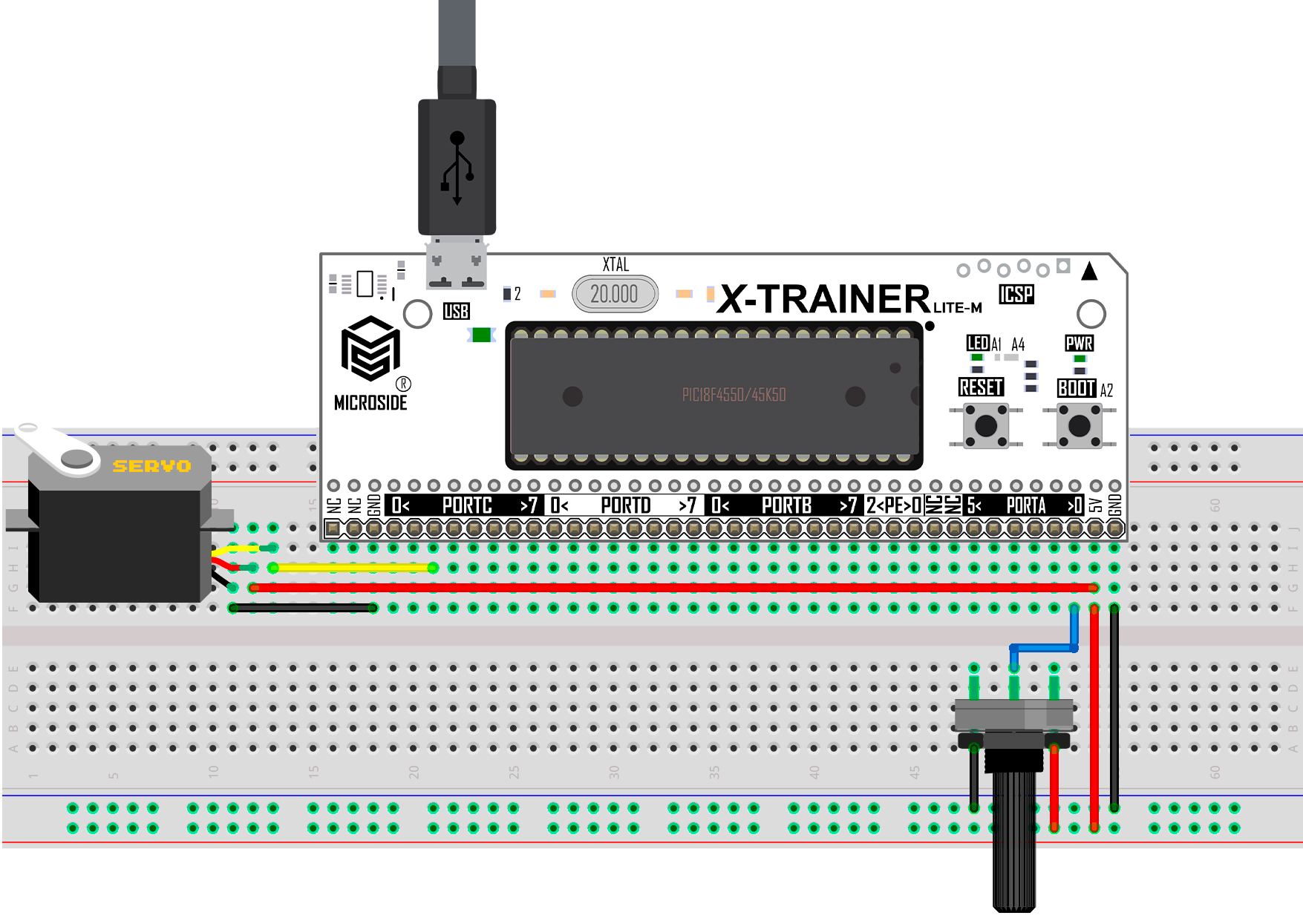 En esta práctica se implementa el control de giro de un servomotor, a través de un potenciómetro. Se usa el módulo PWM para el control del servomotor y el módulo ADC para variar la posición por medio del potenciómetro conectado a la tarjeta X-TRAINER con el PIC18F4550/PIC18F45K50.