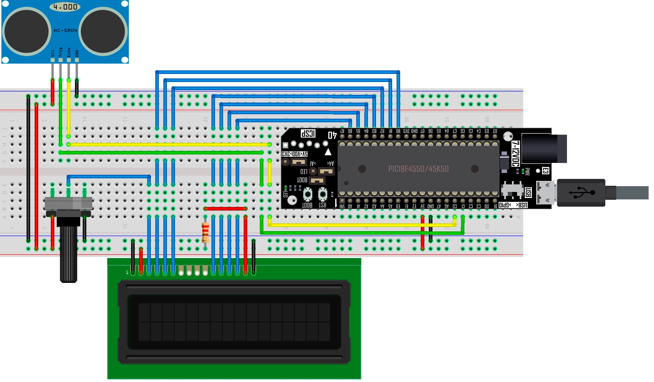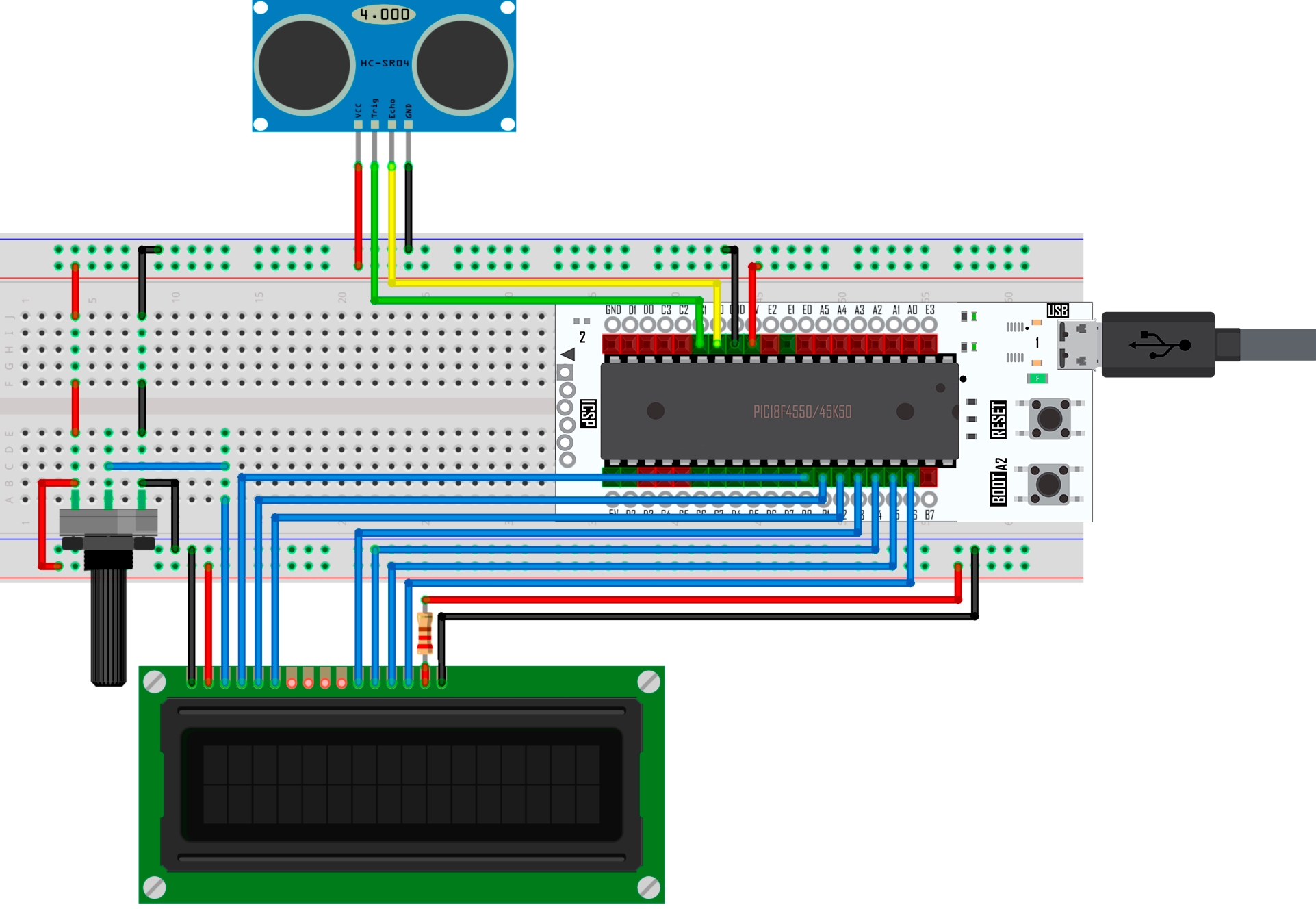 En esta práctica se realiza una medición de distancia (cm) utilizando el sensor ultrasónico HC-SR04, visualizando el resultado de la medición a través de un display LCD (16×2), usando la tarjeta X-TRAINER con el PIC18F4550/PIC18F45K50.