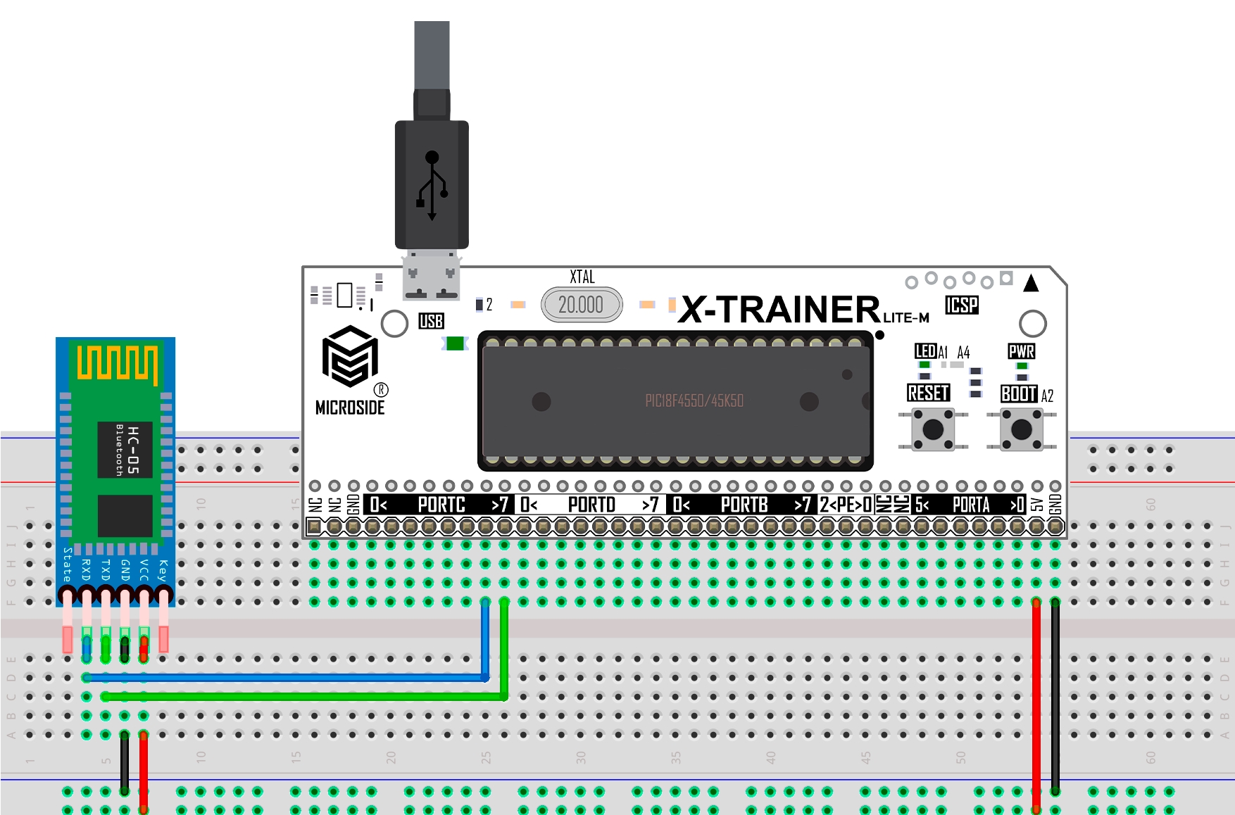 En esta práctica se realiza la conexión con el módulo Bluetooth HC-05 para enviar y recibir datos hacia un smartphone por medio de una aplicación llamada “Serial Bluetooth Terminal” para Android, la cual envía indicaciones para el encendido y apagado de un LED, también pregunta el estado de un push button usando la tarjeta X-TRAINER con el PIC18F4550/PIC18F45K50. Para encender el LED se envía el número 1, si se desea apagar se envía el número 0. Para recibir el estado del push button “BOOT”, se envía el signo “?”, si está presionado recibe el número 1, en caso contrario se recibe el número 0.