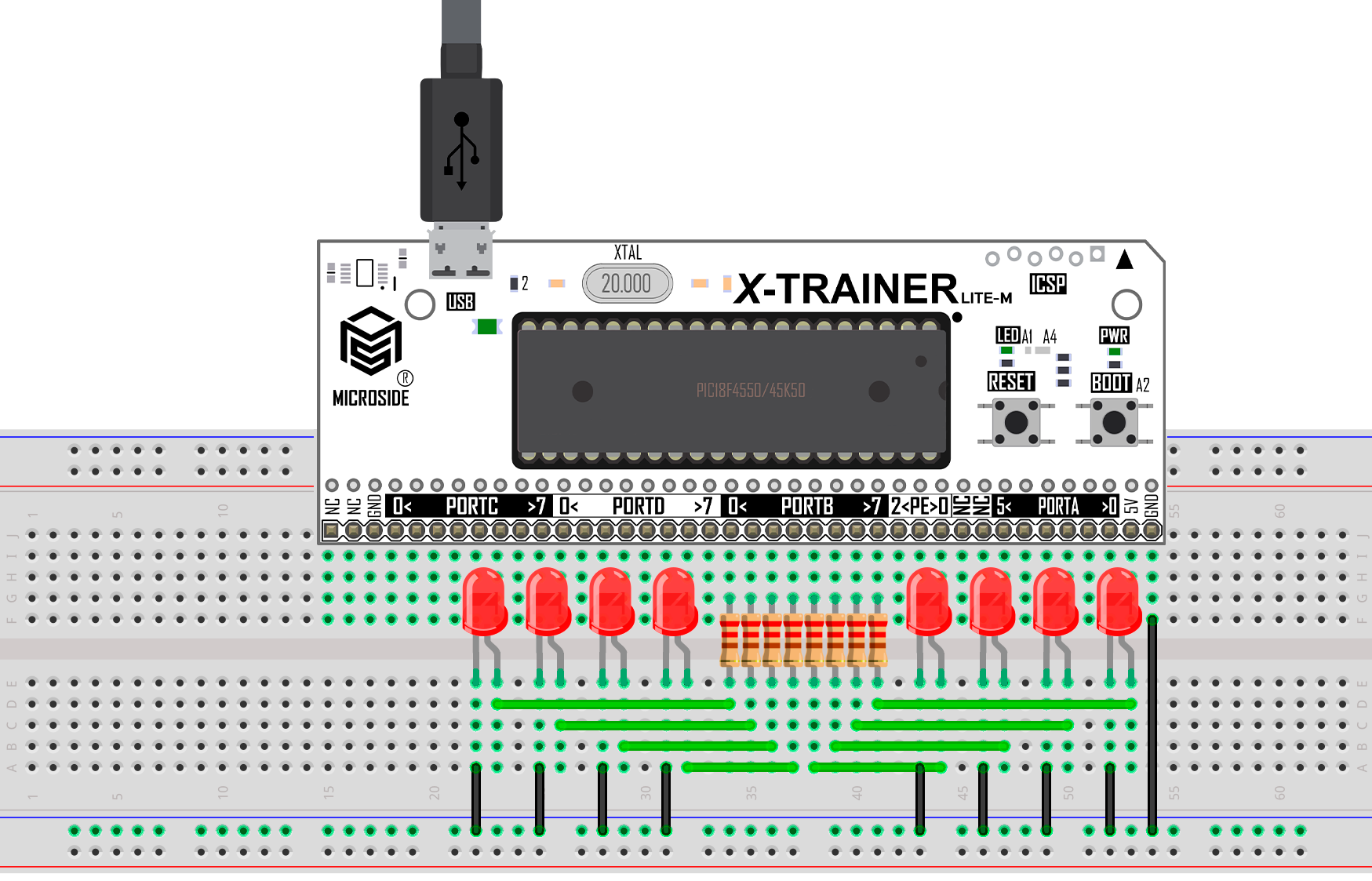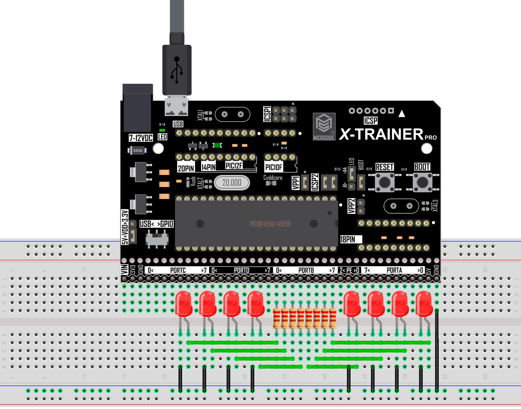 En esta práctica se implementa un corrimiento de bits usando la tarjeta X-TRAINER con el PIC18F4550/PIC18F45K50. Para visualizar el resultado se conectan 8 LEDs al puerto B de la tarjeta X-TRAINER.
