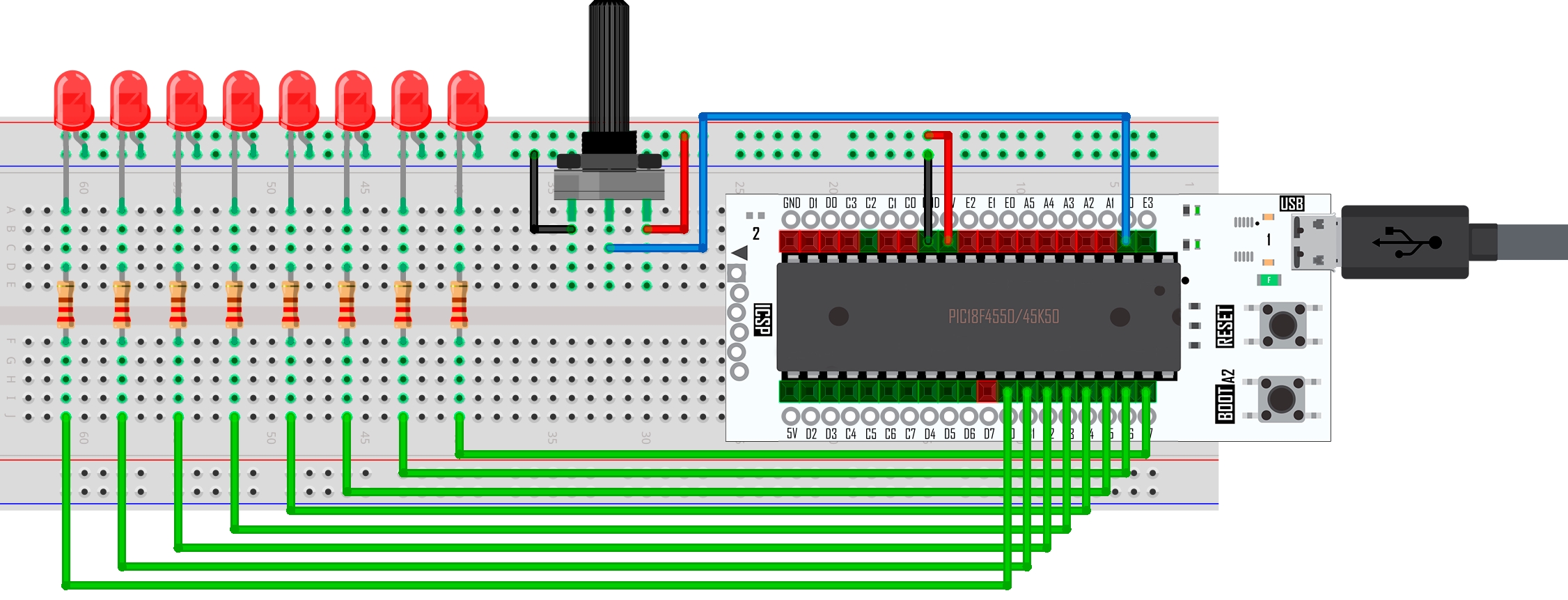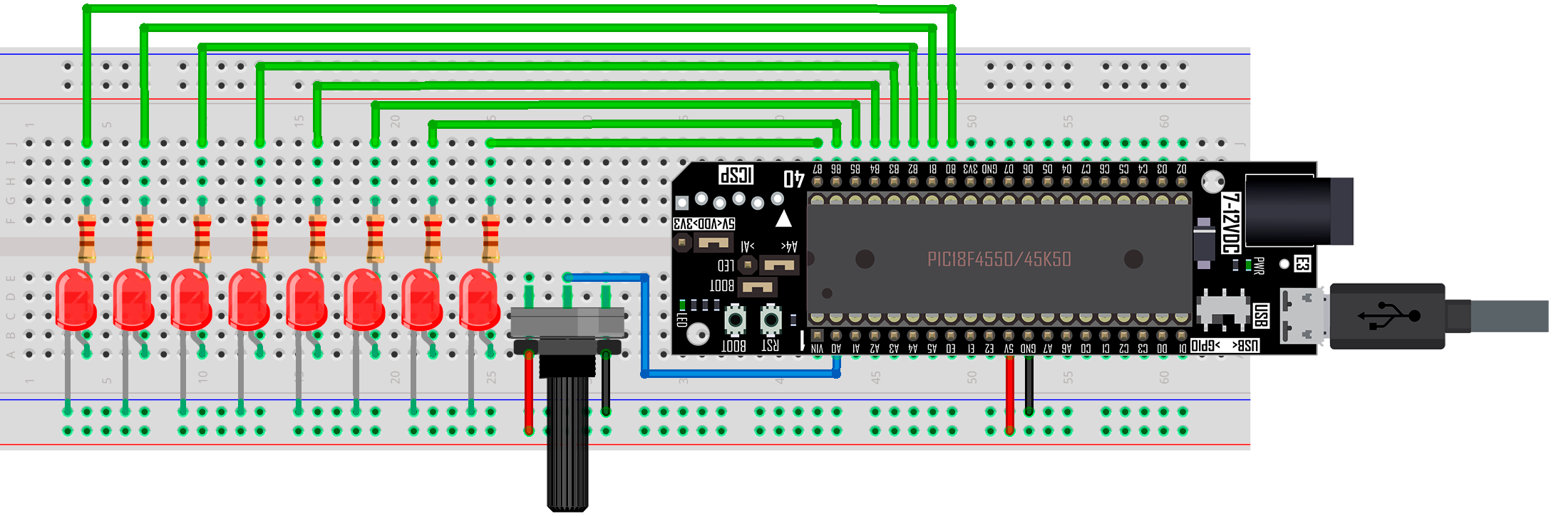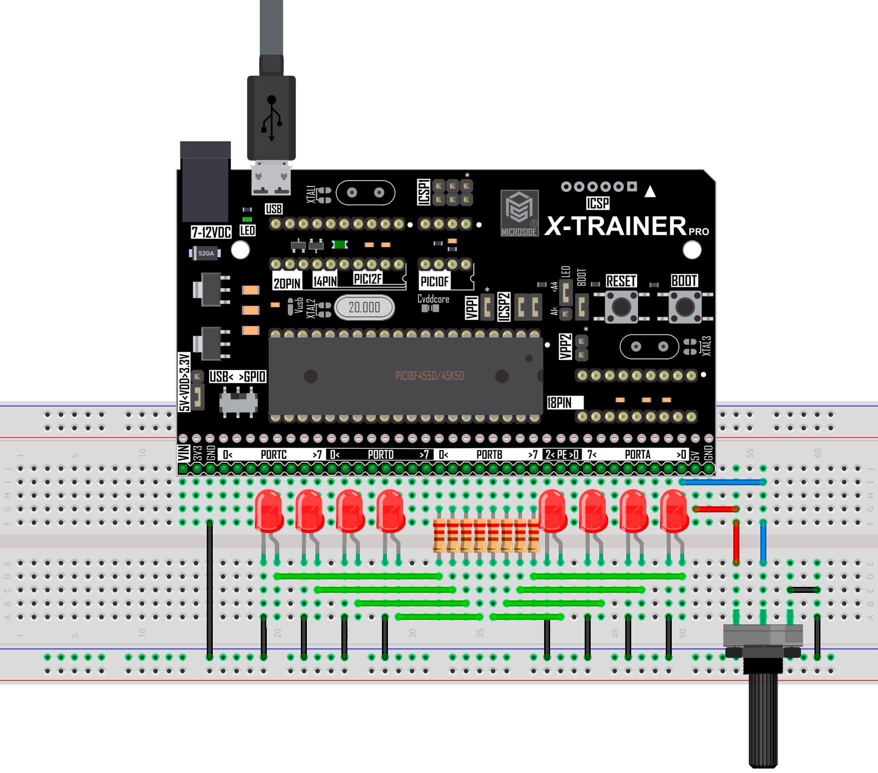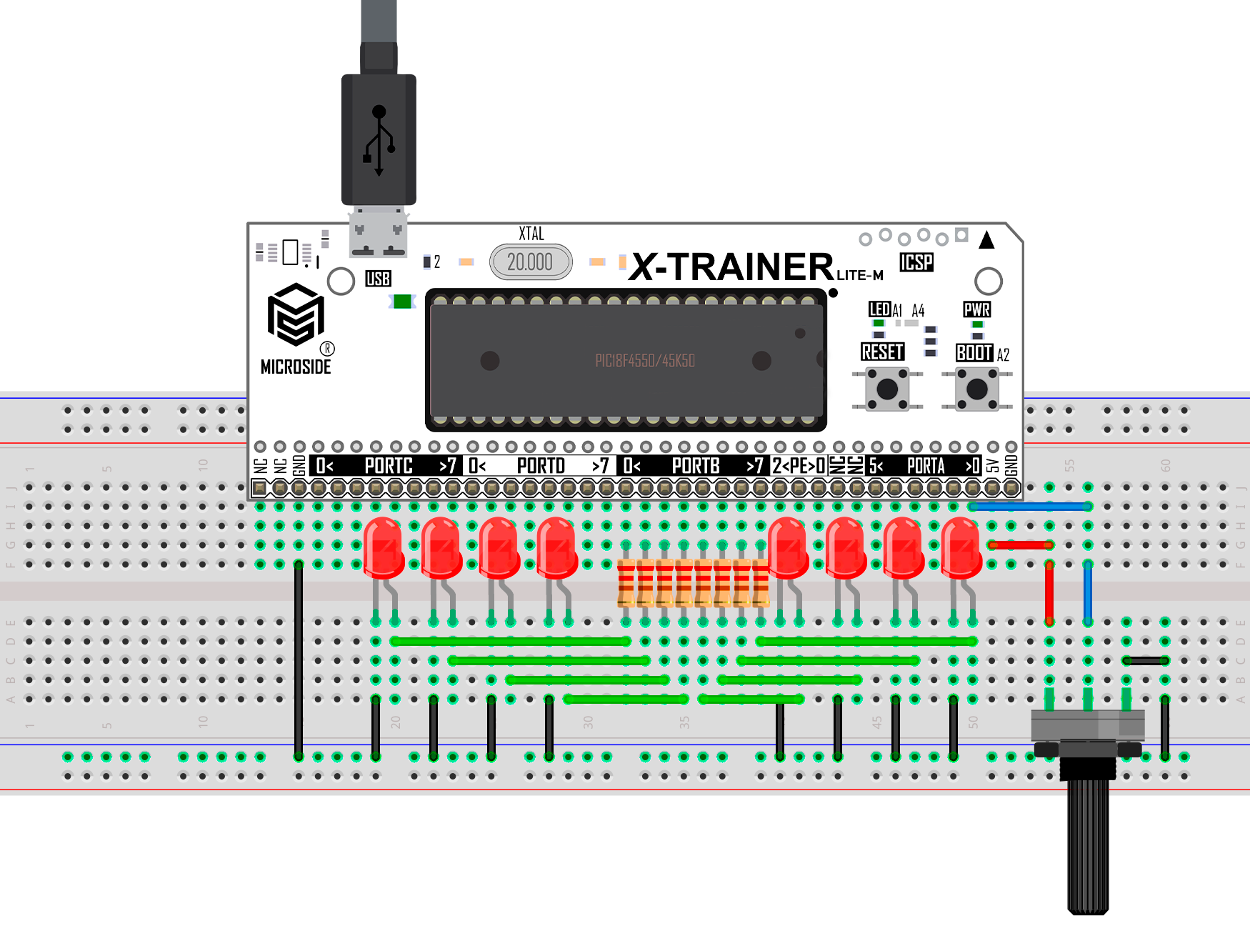 En esta práctica se implementa una lectura analógica, utilizando un potenciómetro, el cual se conecta a la tarjeta X-TRAINER con el PIC18F4550/PIC18F45K50. El potenciómetro se conecta en el pin A0, el cual se configura como entrada y señal analógica. Para visualizar dicha lectura se utilizan 8 LEDs, conectados al puerto B, de tal manera que pueda observarse el incremento o decremento de voltaje del potenciómetro.