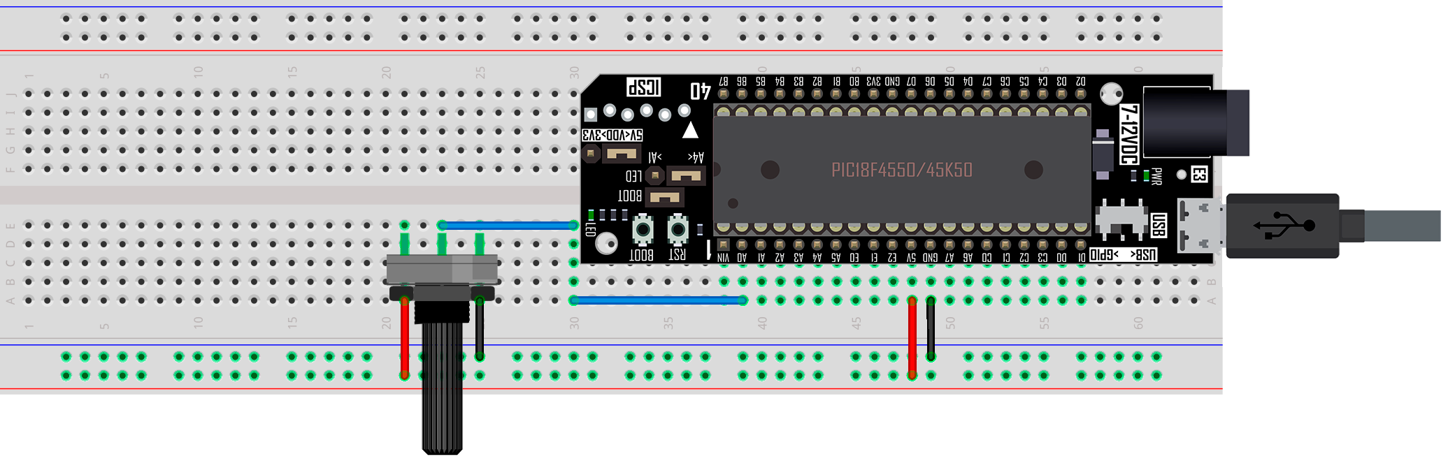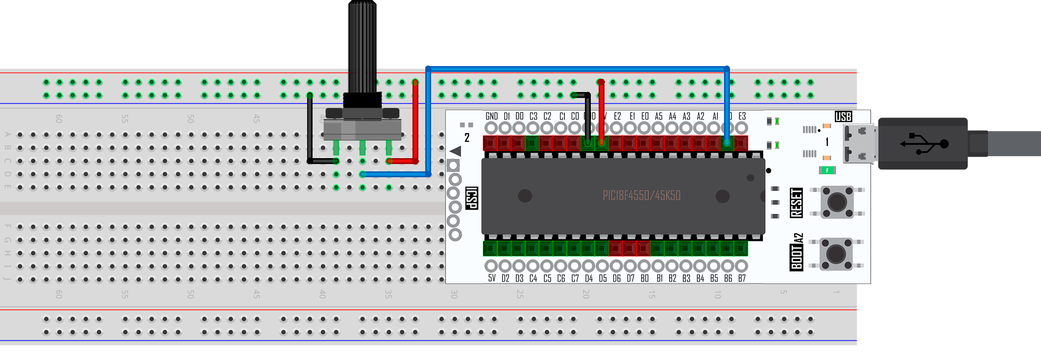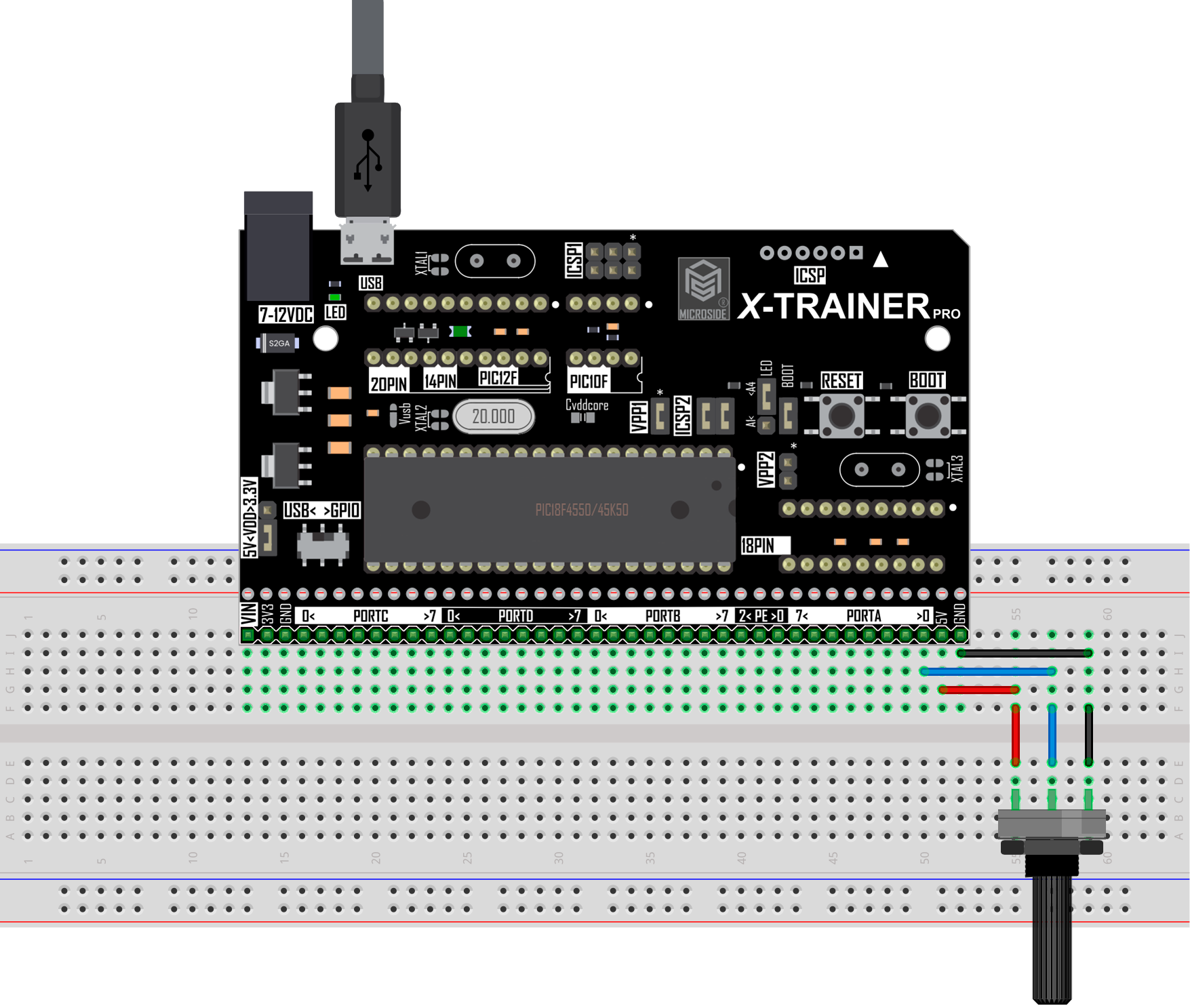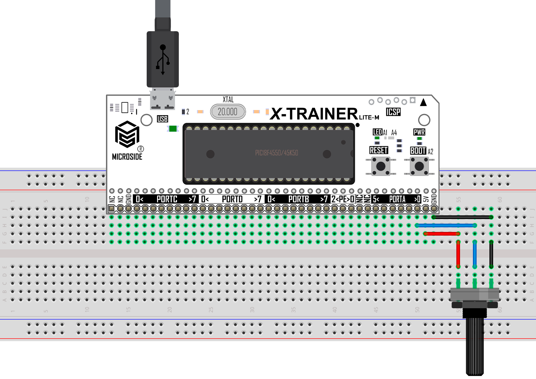 En esta práctica se implementa una lectura analógica utilizando un potenciómetro, el cual se conecta la tarjeta X-TRAINER con el PIC18F4550/PIC18F45K50. El potenciómetro se conecta en el pin A0, el cual se configura como entrada y señal analógica donde, si el valor del ADC supera un Set Point se podrá visualizar el encendido del LED conectado al pin A4 incluido en las tarjetas X-TRAINER.