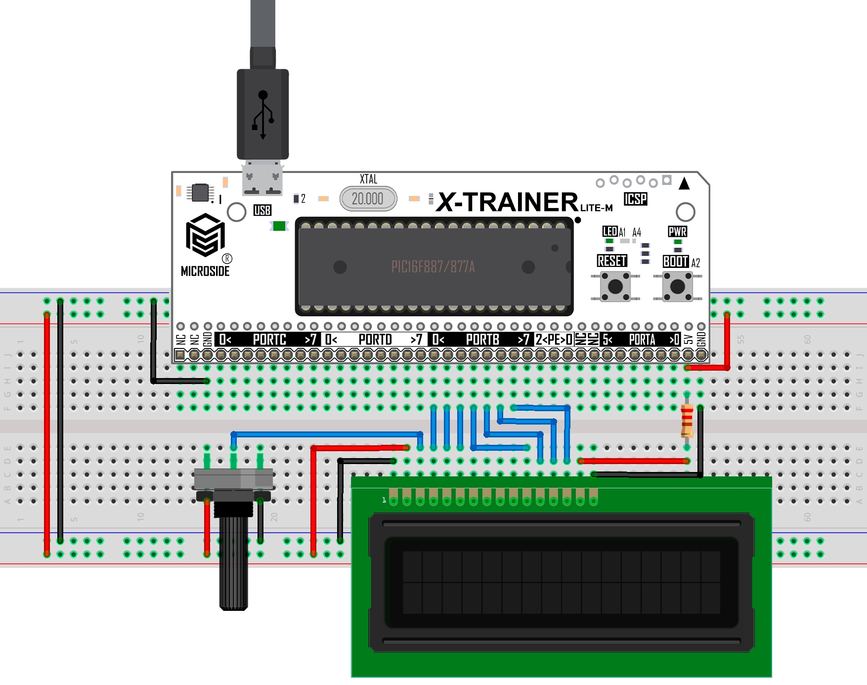 En esta práctica se visualiza un mensaje a través de una pantalla LCD (Liquid Crystal Display) de 16×2, para la comunicación de datos se encuentra conectada al puerto B de la tarjeta X-TRAINER.
