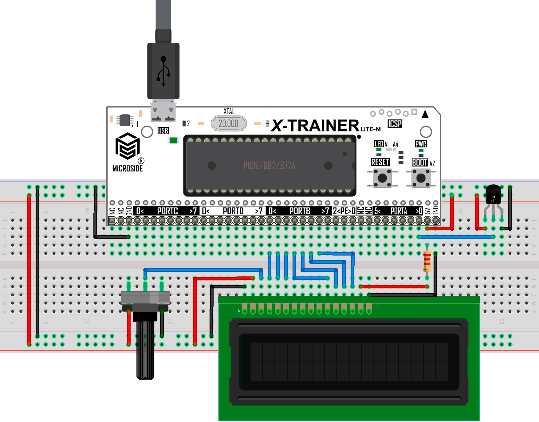 En esta práctica se realiza una medición de temperatura (ºC) con el sensor LM35, visualizando el resultado de la medición a través de un display LCD (16×2), usando la tarjeta X-TRAINER con el PIC16F887/PIC16F877A.