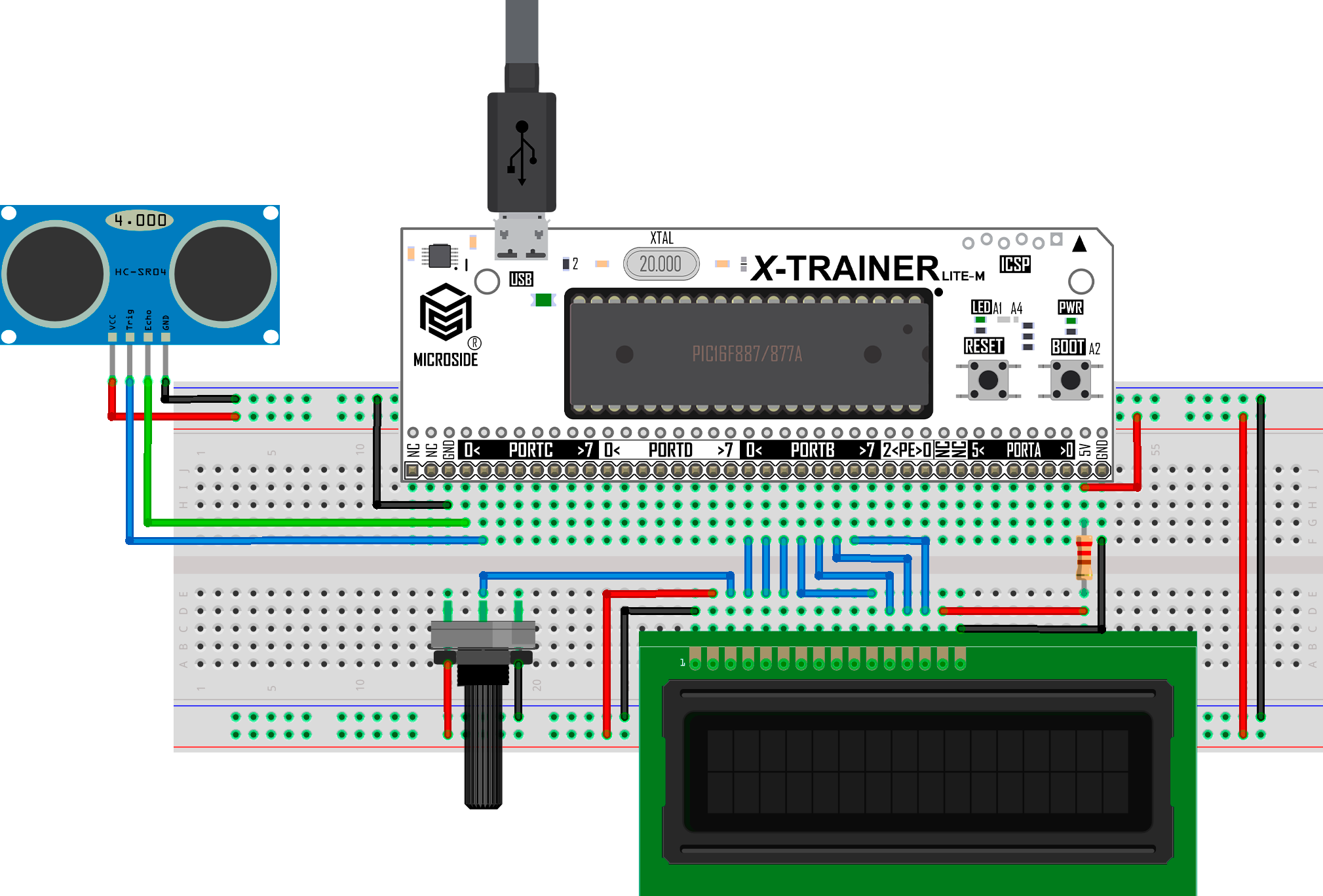 En esta práctica se realiza una medición de distancia (cm) utilizando el sensor ultrasónico HC-SR04, visualizando el resultado de la medición a través de un display LCD (16×2), usando la tarjeta X-TRAINER con el PIC16F887/PIC16F877A.