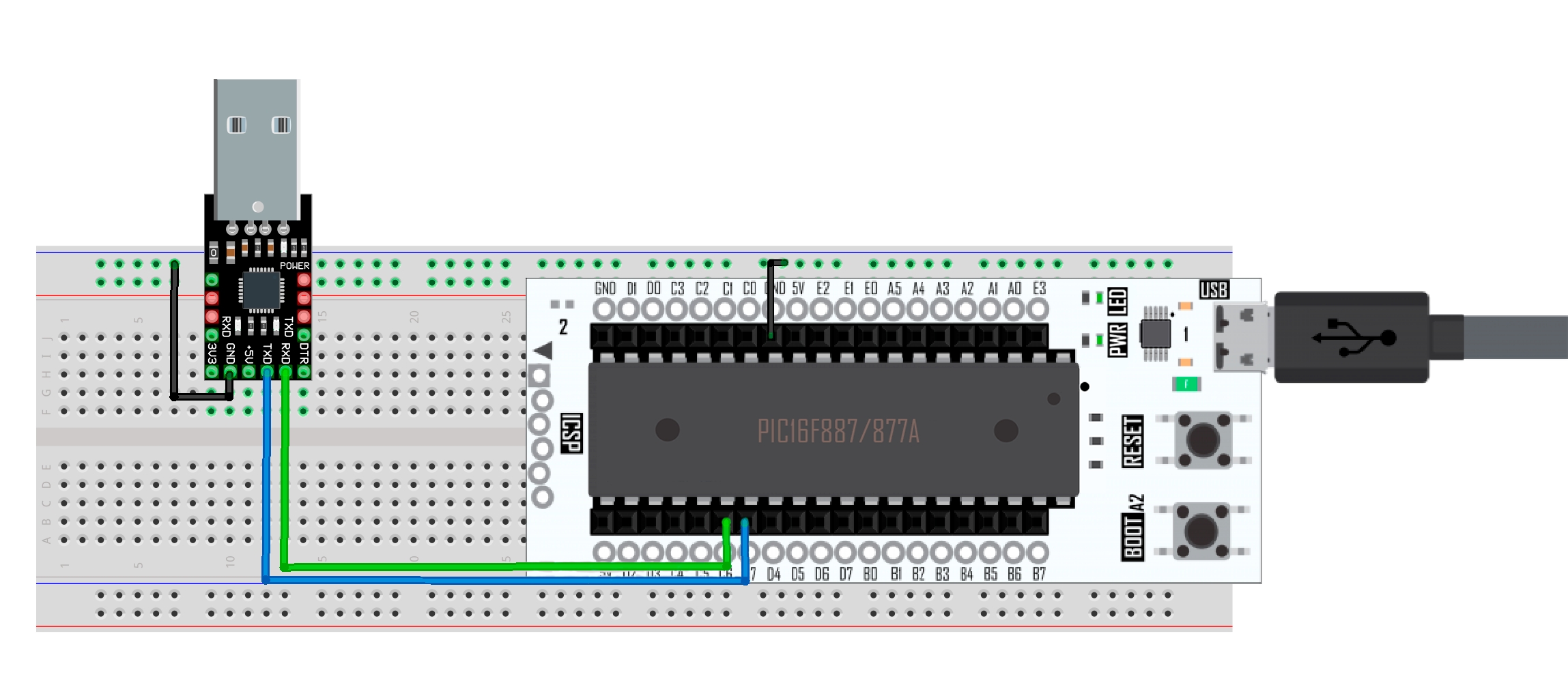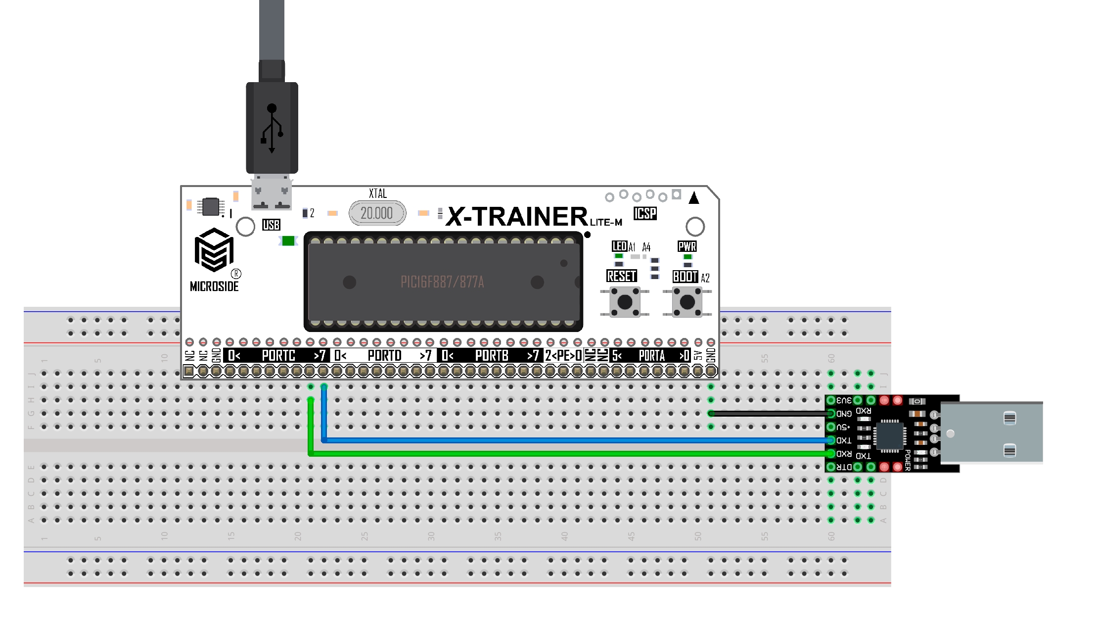 En esta práctica se implementa una comunicación serial UART a 9600 baudios, usando la tarjeta X-TRAINER con el PIC16F887/PIC16F877A. Desde una terminal serial (en este ejemplo se utiliza el software Hercules), se envían y reciben datos por medio de un módulo convertidor USB a Serial UART. Para encender el LED incluido en la Tarjeta X-TRAINER se envía el número 1, si se desea apagar se envía el número 0. Para recibir el estado del botón BOOT, se envía el signo “?”, si el botón está presionado recibe el número 1, en caso contrario se recibe el número 0.
