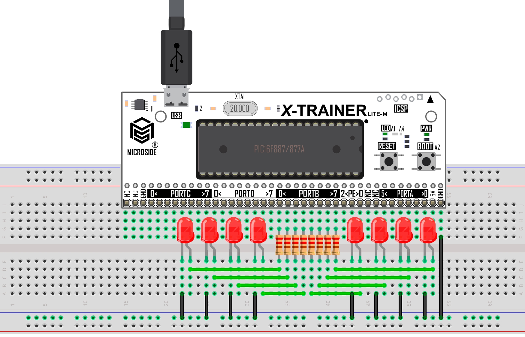 En esta práctica se implementa un corrimiento de bits usando la tarjeta X-TRAINER con el PIC16F887/PIC16F877A.Para visualizar el resultado se conectan 8 LEDs al puerto B de la tarjeta X-TRAINER.