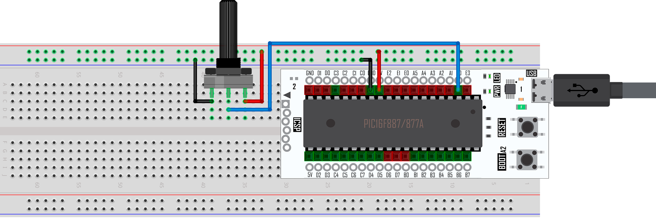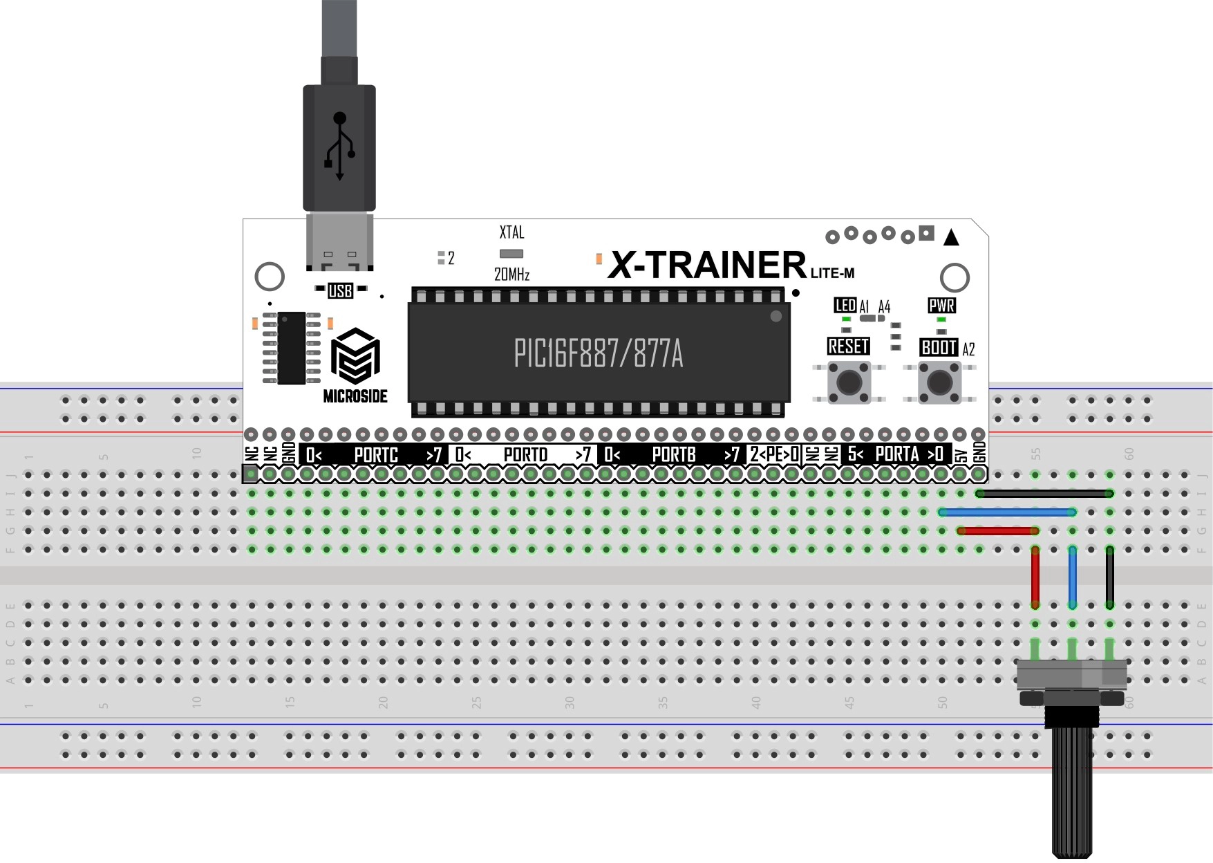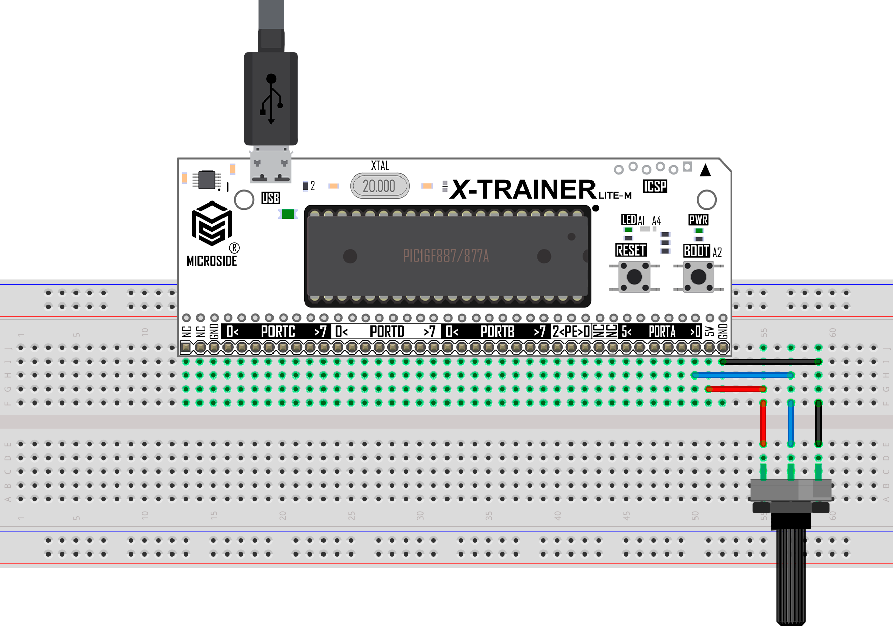 En esta práctica se implementa una lectura analógica utilizando un potenciómetro, el cual se conecta la tarjeta X-TRAINER con el PIC16F887/PIC16F877A. El potenciómetro se conecta en el pin A0, el cual se configura como entrada y señal analógica donde, si el valor del ADC supera un Set Point se podrá visualizar el encendido del LED conectado al pin A4 incluido en las tarjetas X-TRAINER.