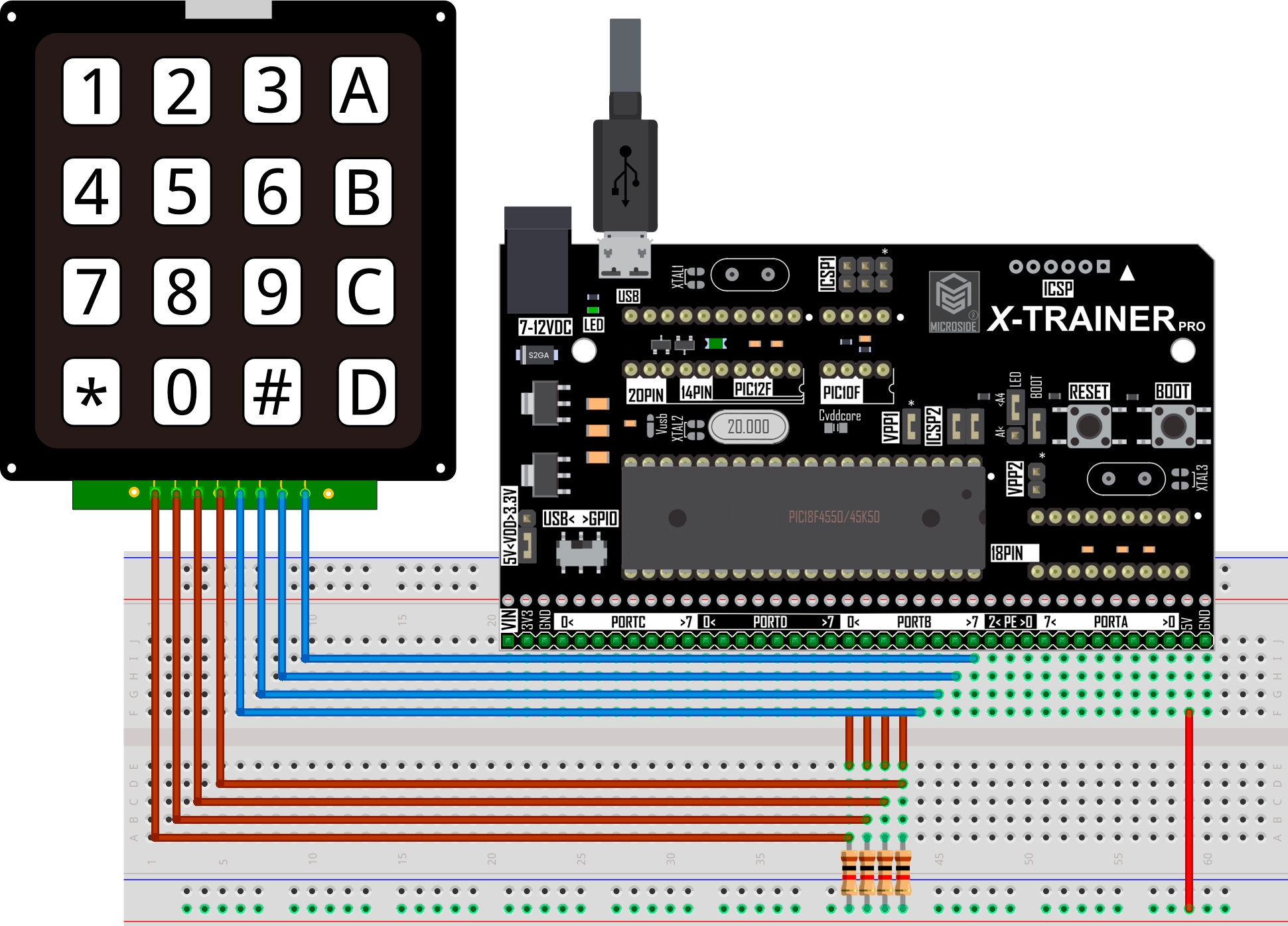 En esta práctica se realiza el control de encendido y apagado del LED incluido en la tarjeta X-TRAINER con el PIC18F4550/PIC18F45K50. También se utiliza un teclado matricial de 4×4, el cual está conectado en el puerto B con 4 resistencias configuradas como pull-down (B0-B3). Para encender el LED se presiona la tecla 1 y para apagar el LED se presiona la tecla 0.