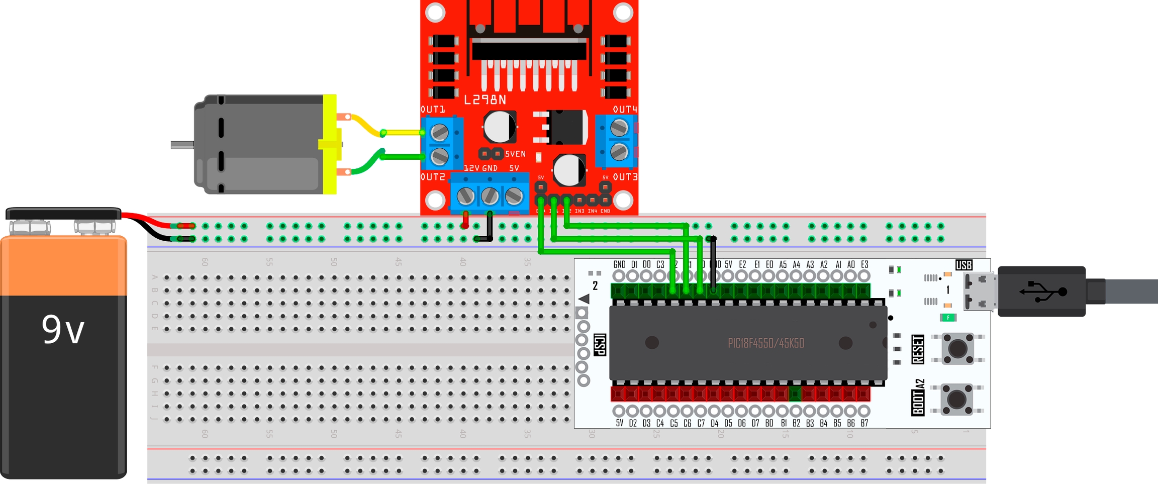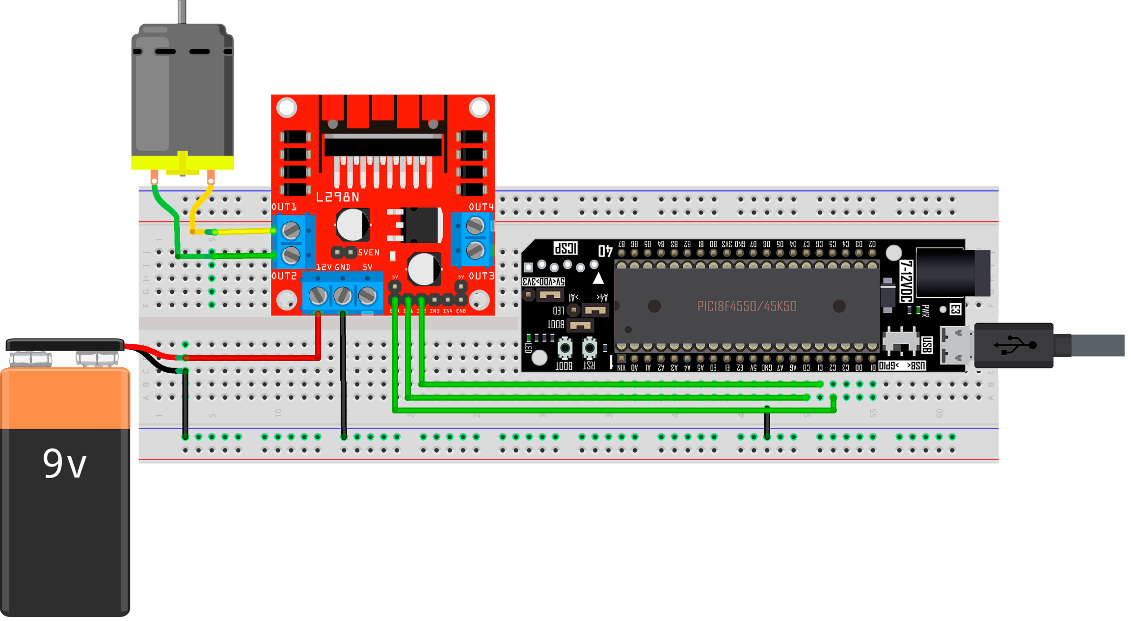 En esta práctica se usa el módulo PWM (Pulse Width Modulation) del pin C2, para el aumento y disminución de la velocidad de giro de un motor DC. Con ayuda de un driver LM298N que se encuentra conectado a los pines C0 y C1 de la tarjeta X-TRAINER con el PIC18F4550/PIC18F45K50, se realiza una inversión de giro.