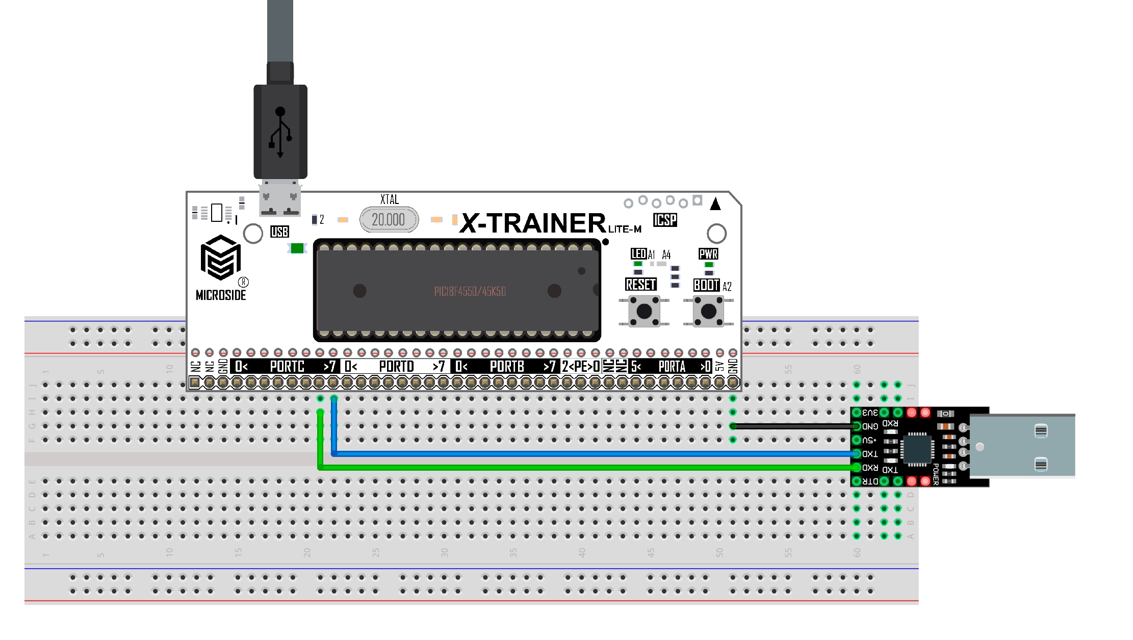 En esta práctica se implementa una comunicación serial UART a 9600 baudios, usando la tarjeta X-TRAINER con el PIC18F4550/PIC18F45K50. Desde una terminal serial (en este ejemplo se utiliza el software Hercules), se envían y reciben datos por medio de un módulo convertidor USB a Serial UART. Para encender el LED incluido en la Tarjeta X-TRAINER se envía el número 1, si se desea apagar se envía el número 0. Para recibir el estado del botón BOOT, se envía el signo “?”, si el botón está presionado recibe el número 1, en caso contrario se recibe el número 0.