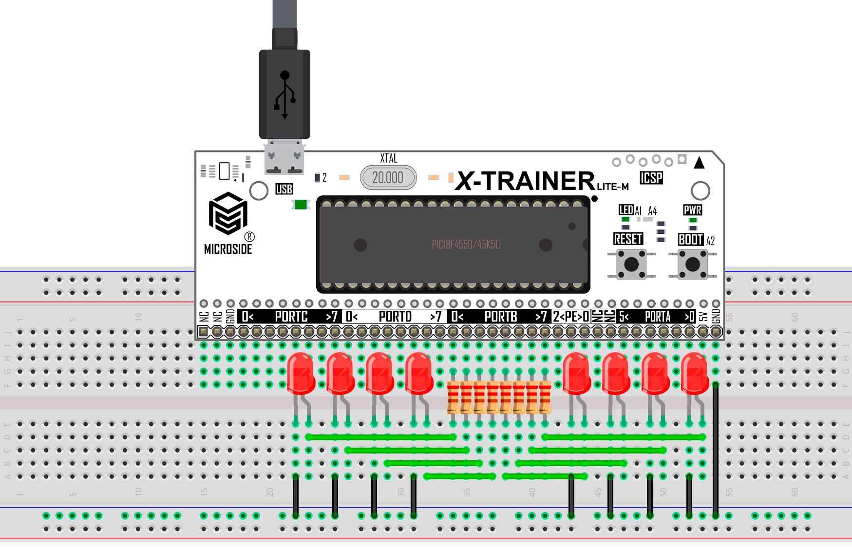 En esta práctica se implementa un contador binario usando la tarjeta X-TRAINER con el PIC18F4550/PIC18F45K50. El contador se incrementa cada vez que se presiona un botón conectado al pin A2, configurado como entrada digital. Para visualizar el valor del contador se utilizan 8 LEDs.