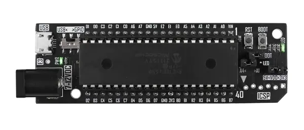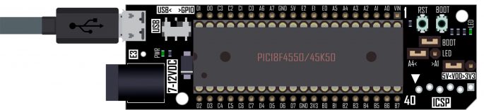 <table data-header-hidden><thead><tr><th></th><th></th><th data-hidden></th></tr></thead><tbody><tr><td>Microcontrolador</td><td><a href="https://www.microchip.com/en-us/product/PIC18F45K50">PIC18F45K50</a> o <a href="https://www.microchip.com/en-us/product/PIC18F4550">PIC18F4550</a></td><td></td></tr><tr><td>Voltaje de operación</td><td>3.3 - 5 VDC</td><td></td></tr><tr><td>Voltaje de alimentación externa</td><td>7 - 12 VDC</td><td></td></tr><tr><td>Pines</td><td>40</td><td></td></tr><tr><td>Puerto de programación</td><td>ICSP</td><td></td></tr><tr><td>Tamaño</td><td>90.41 x 29.32 x 20.65 mm</td><td></td></tr></tbody></table>