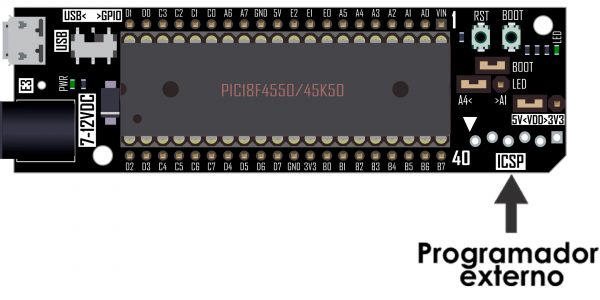 **Nota**: Si se usa un PIC con bootloader precargado y un programador externo por medio del puerto ICSP se **borrará** el bootloader y será necesario adquirir un nuevo PIC.
