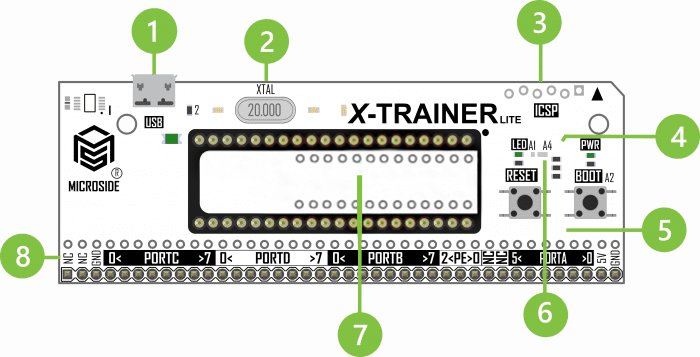 **X-TRAINER LITE M** se ofrece con un microcontrolador [**PIC18F45K50**](https://www.microchip.com/en-us/product/PIC18F45K50) precargado con **bootloader Microside** para un uso inmediato a través del puerto micro USB sin necesidad de un programador externo.