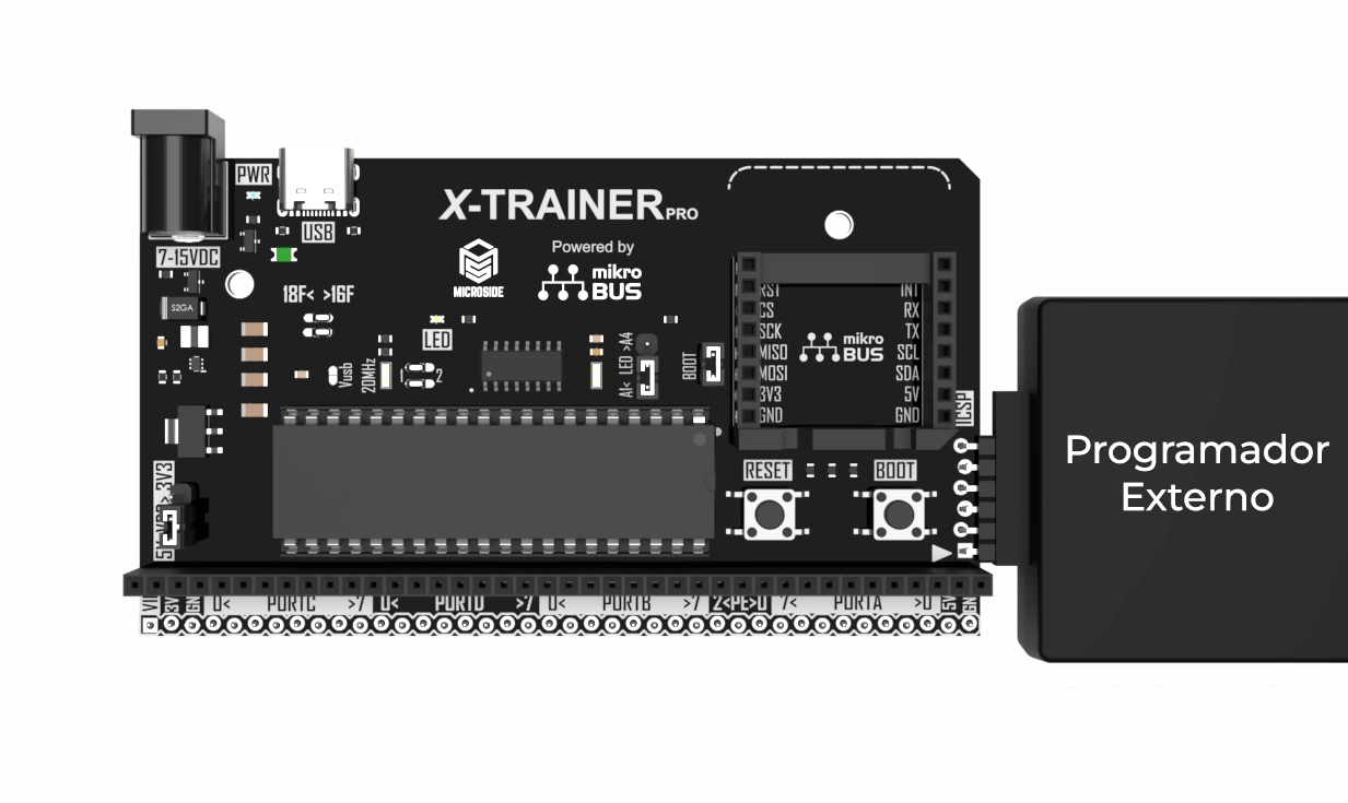 X-TRAINER PRO R4 se ofrece con un microcontrolador PIC16F877A precargado con bootloader para un uso inmediato a través del puerto USB sin necesidad de un programador externo.