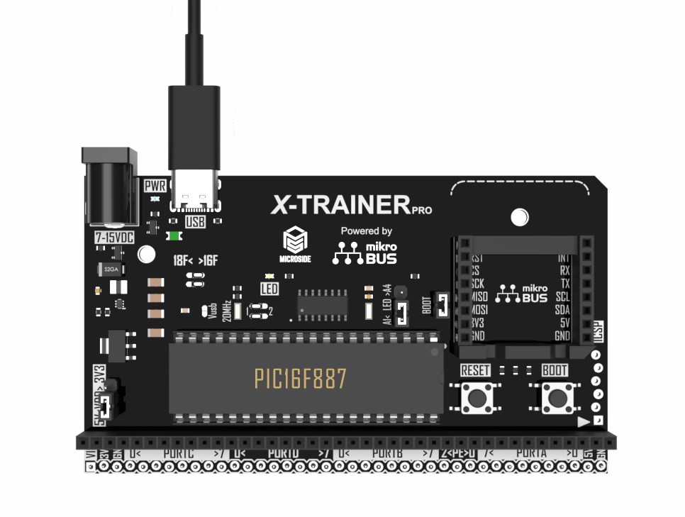 X-TRAINER PRO R4 se ofrece con un microcontrolador [**PIC16F887**](https://www.microchip.com/en-us/product/PIC16F887) precargado con **bootloader** para un uso inmediato a través del puerto USB sin necesidad de un programador externo.